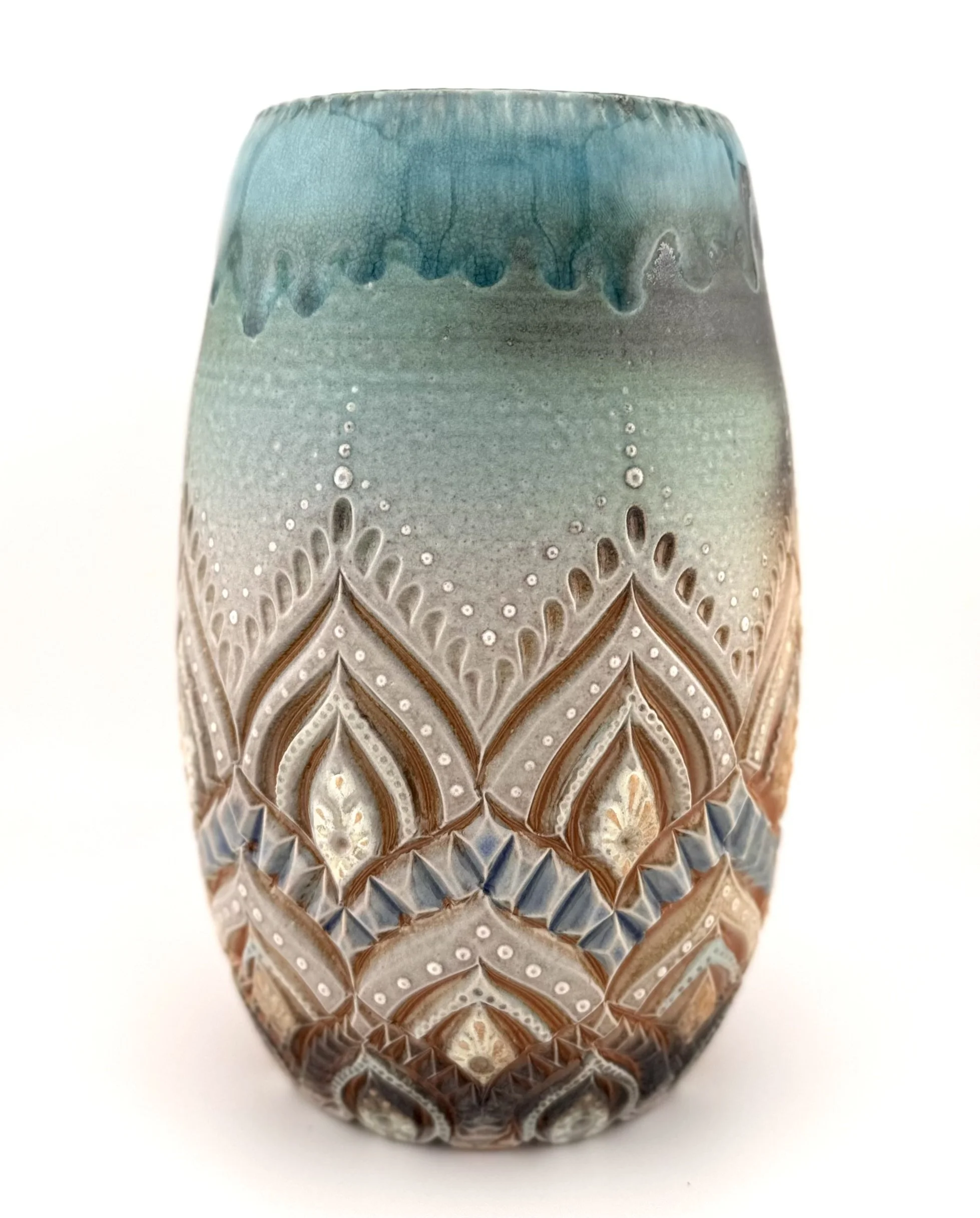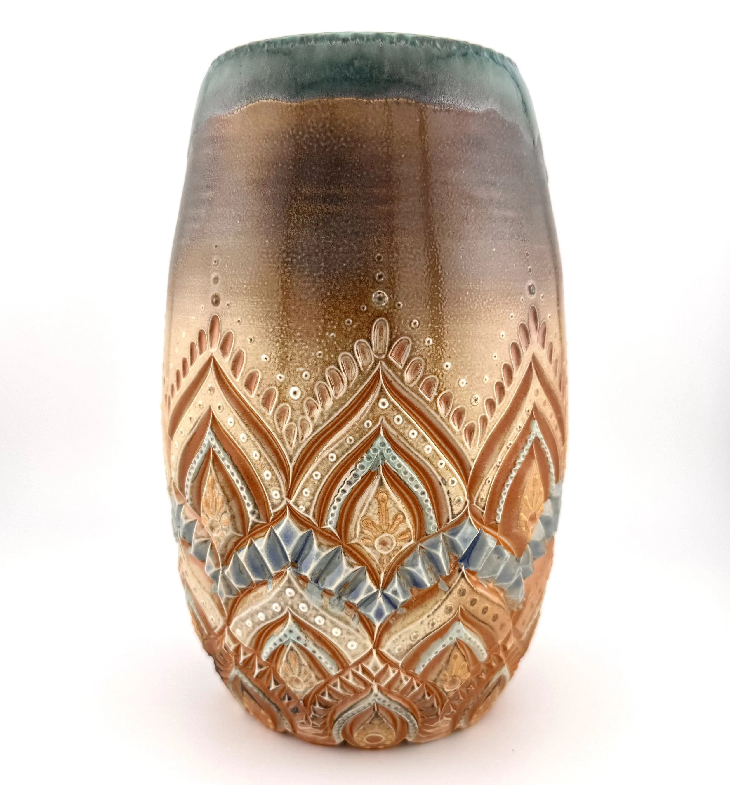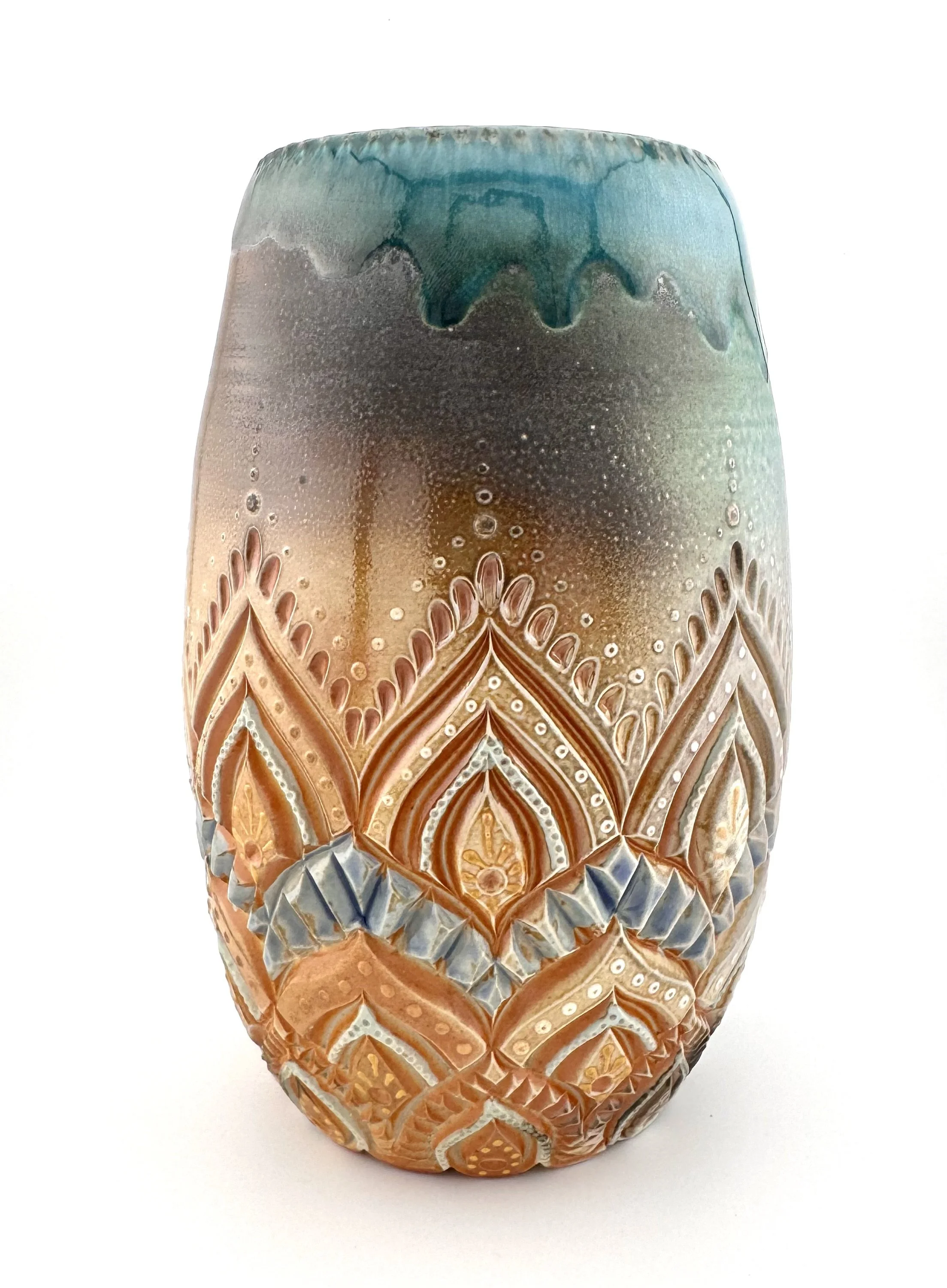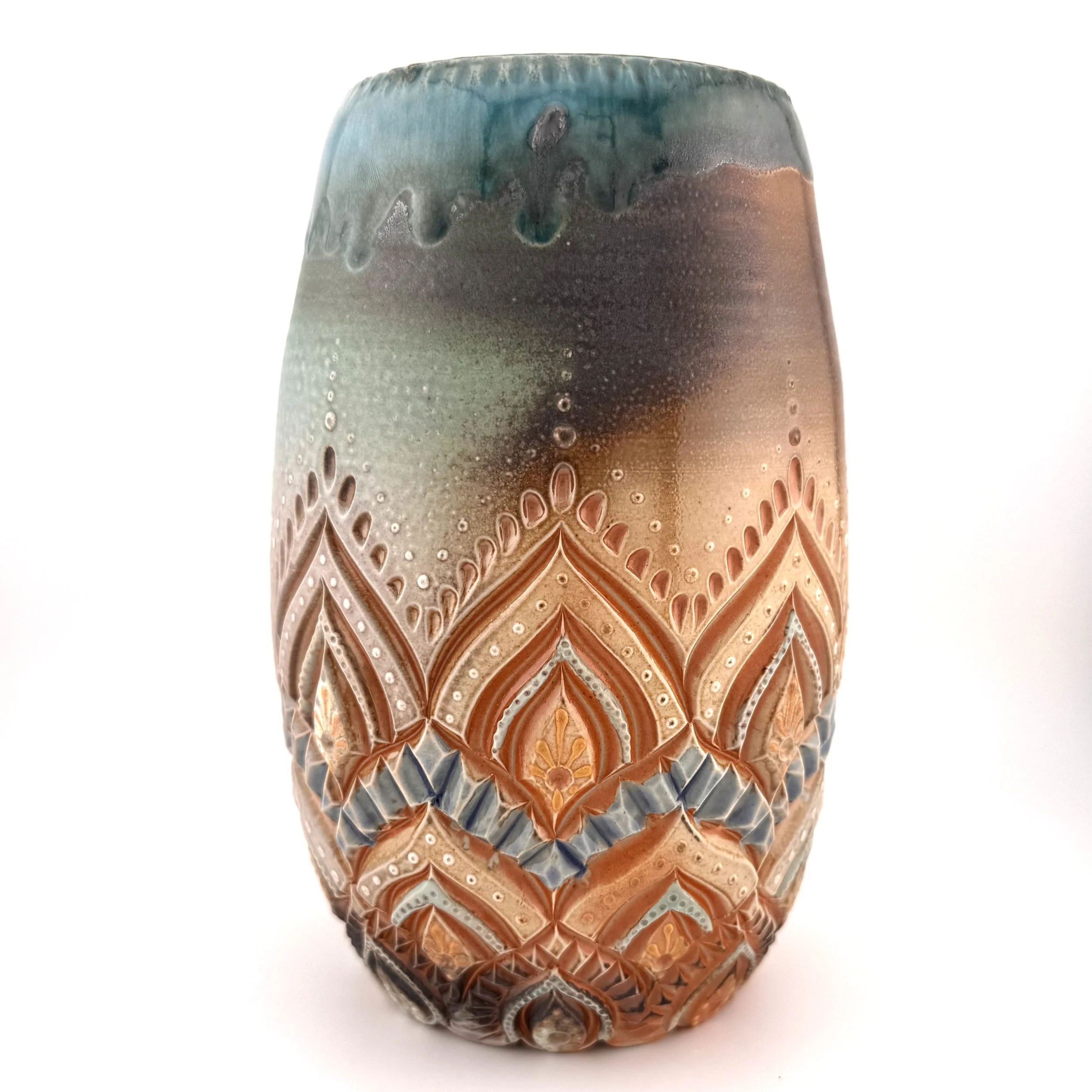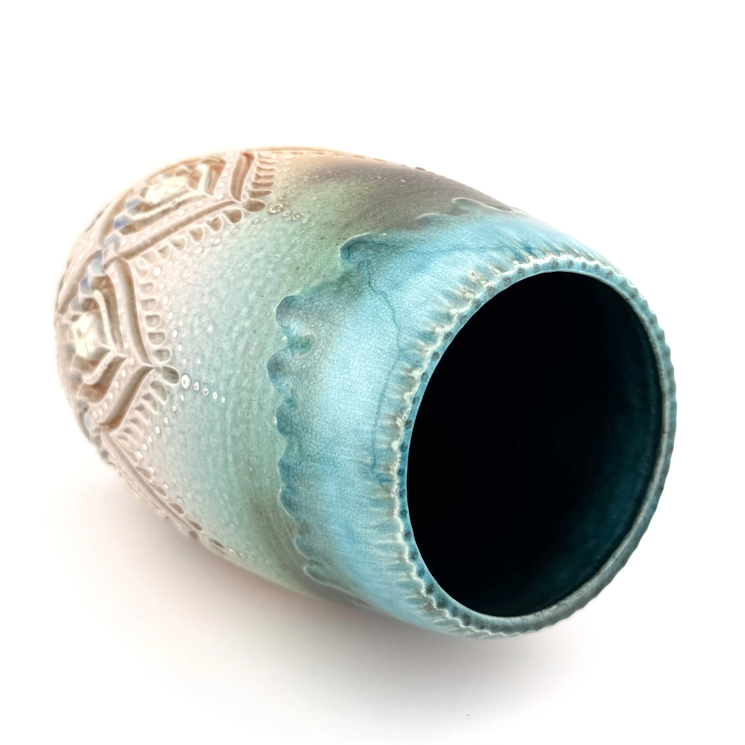 A dramatic addition to any home, this white hand carved vase was sprayed with a cobalt blue vase to accentuate it’s designs. The wide opening makes it perfect for any bouquet, and with or without flowers it’s a work of art on your table.