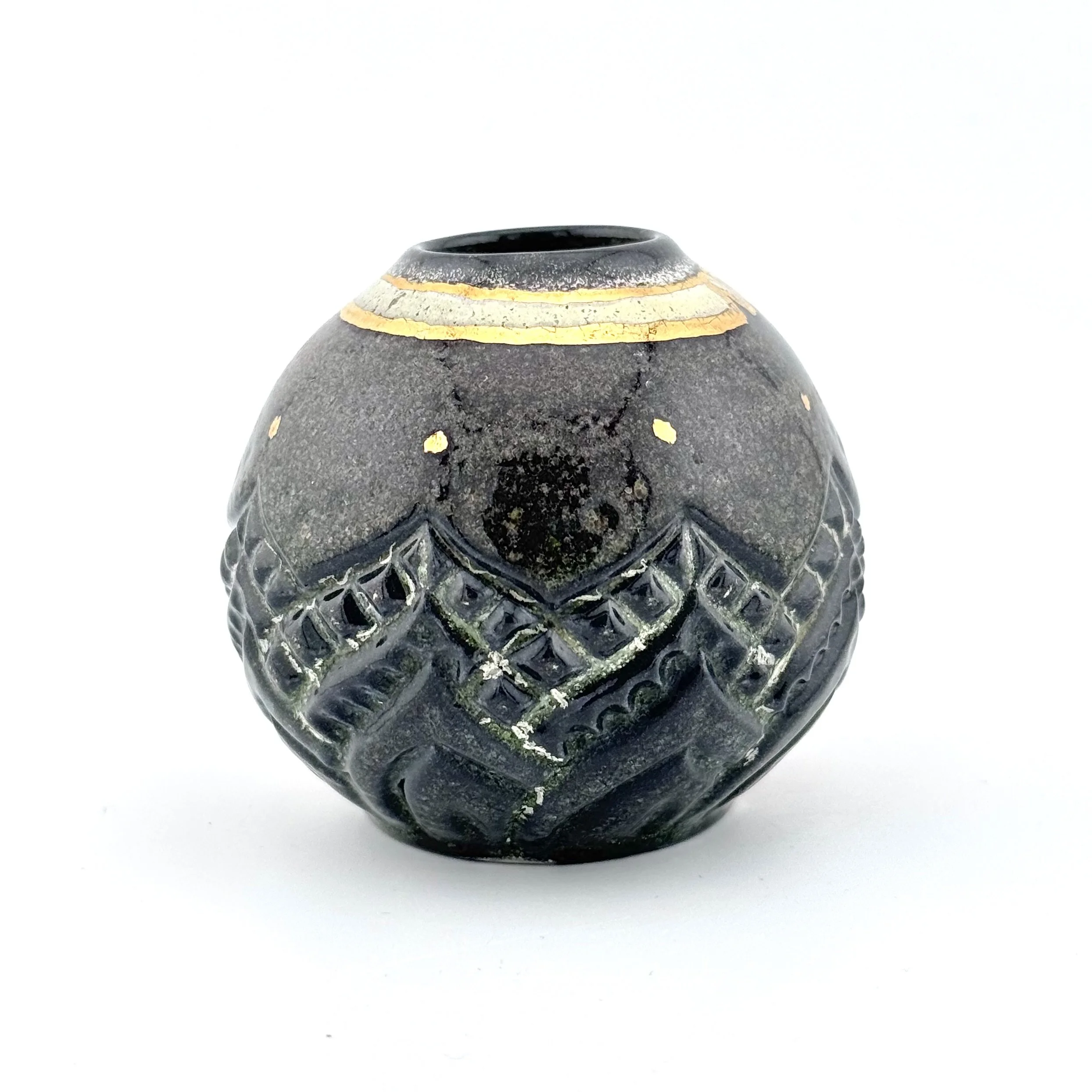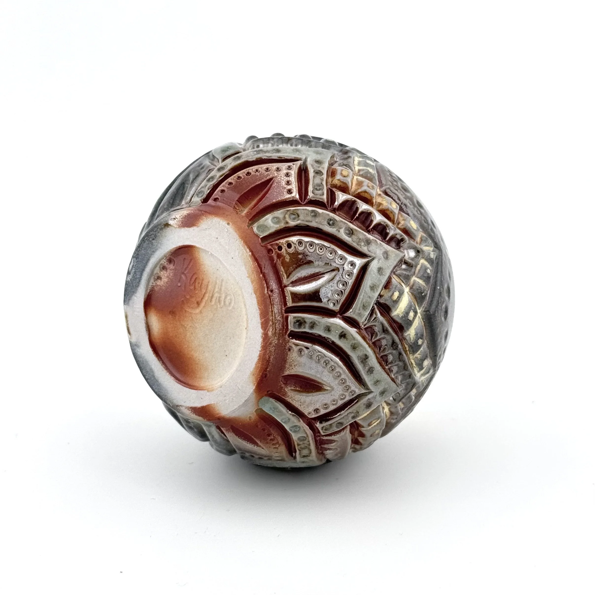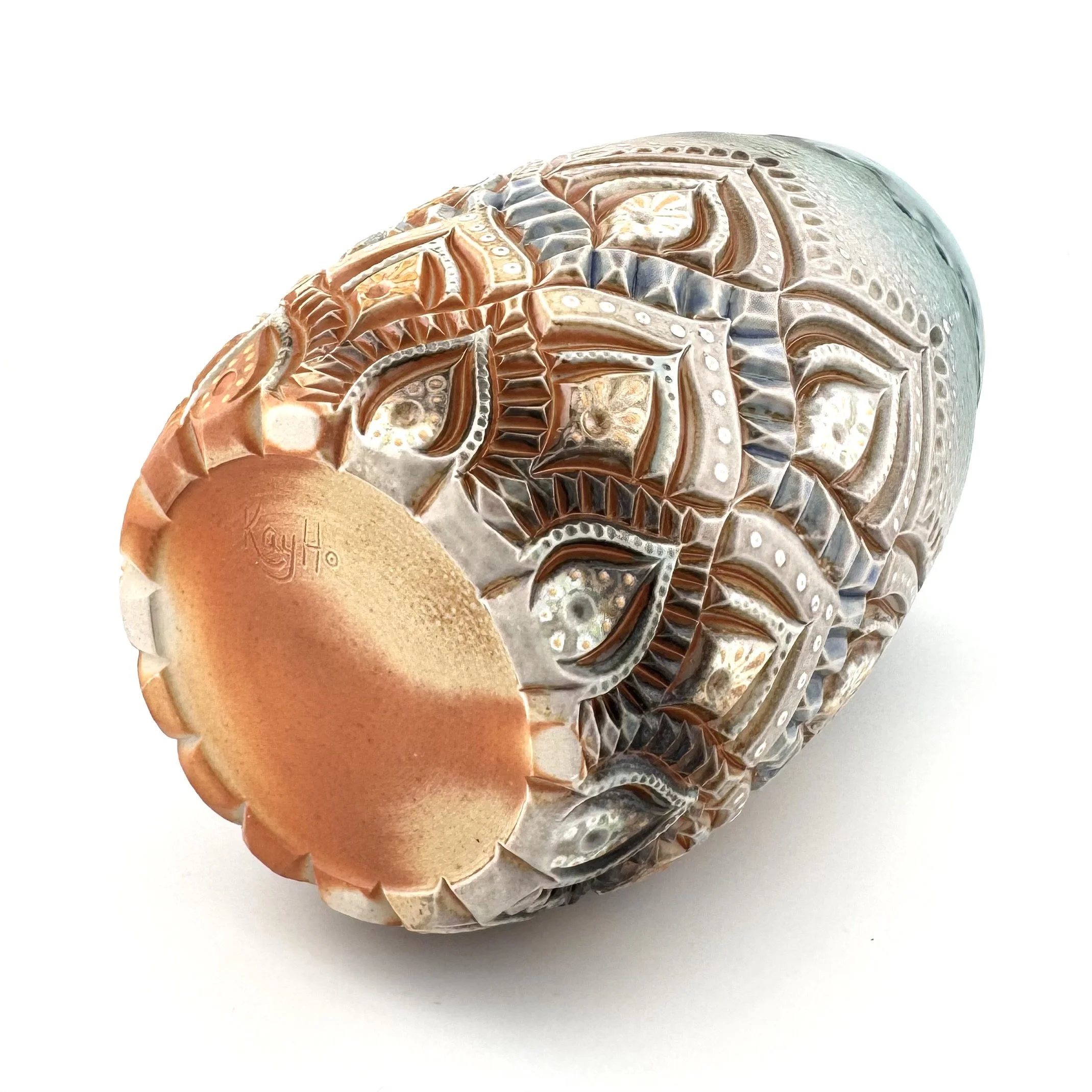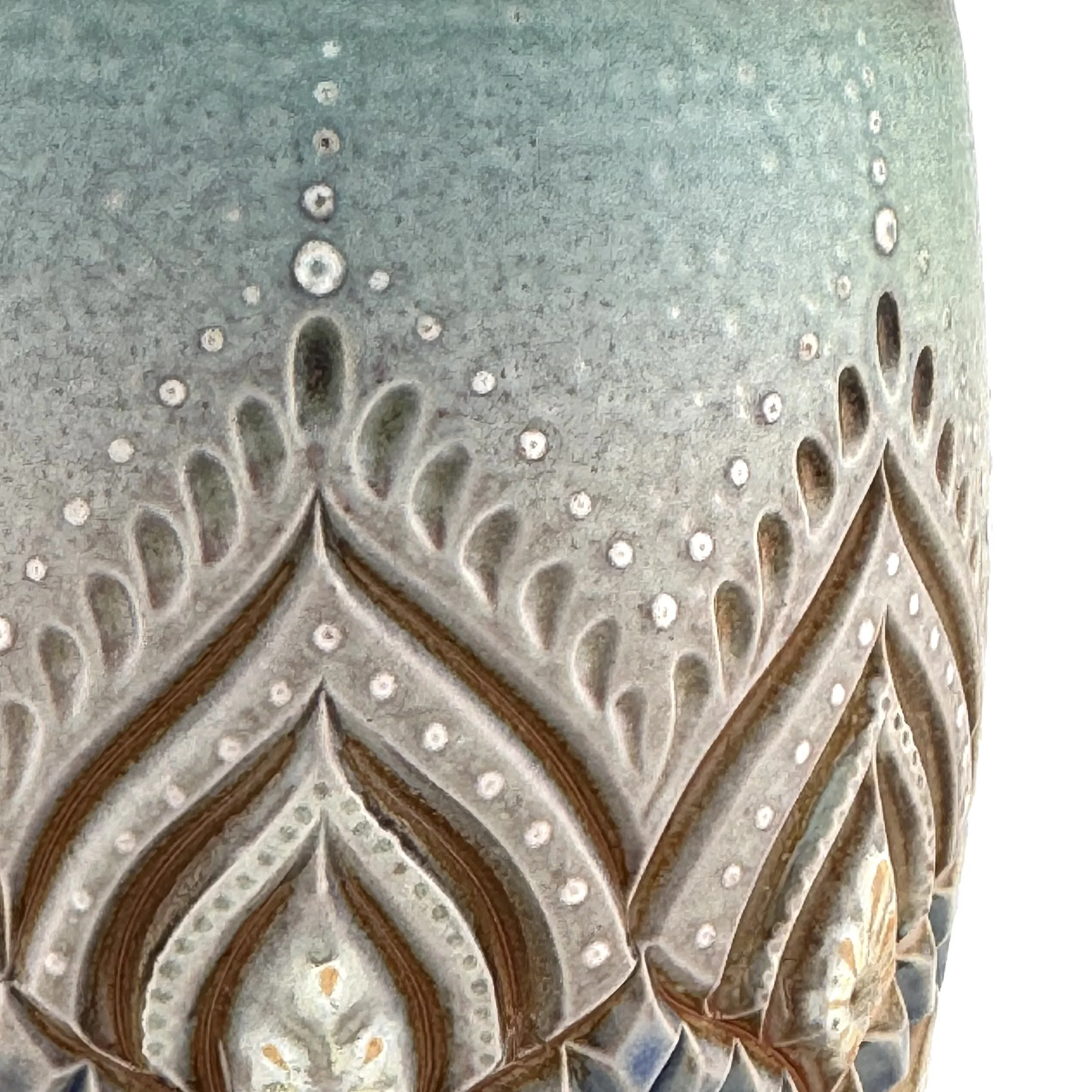 A dramatic addition to any home, this white hand carved vase was sprayed with a cobalt blue vase to accentuate it’s designs. The wide opening makes it perfect for any bouquet, and with or without flowers it’s a work of art on your table.