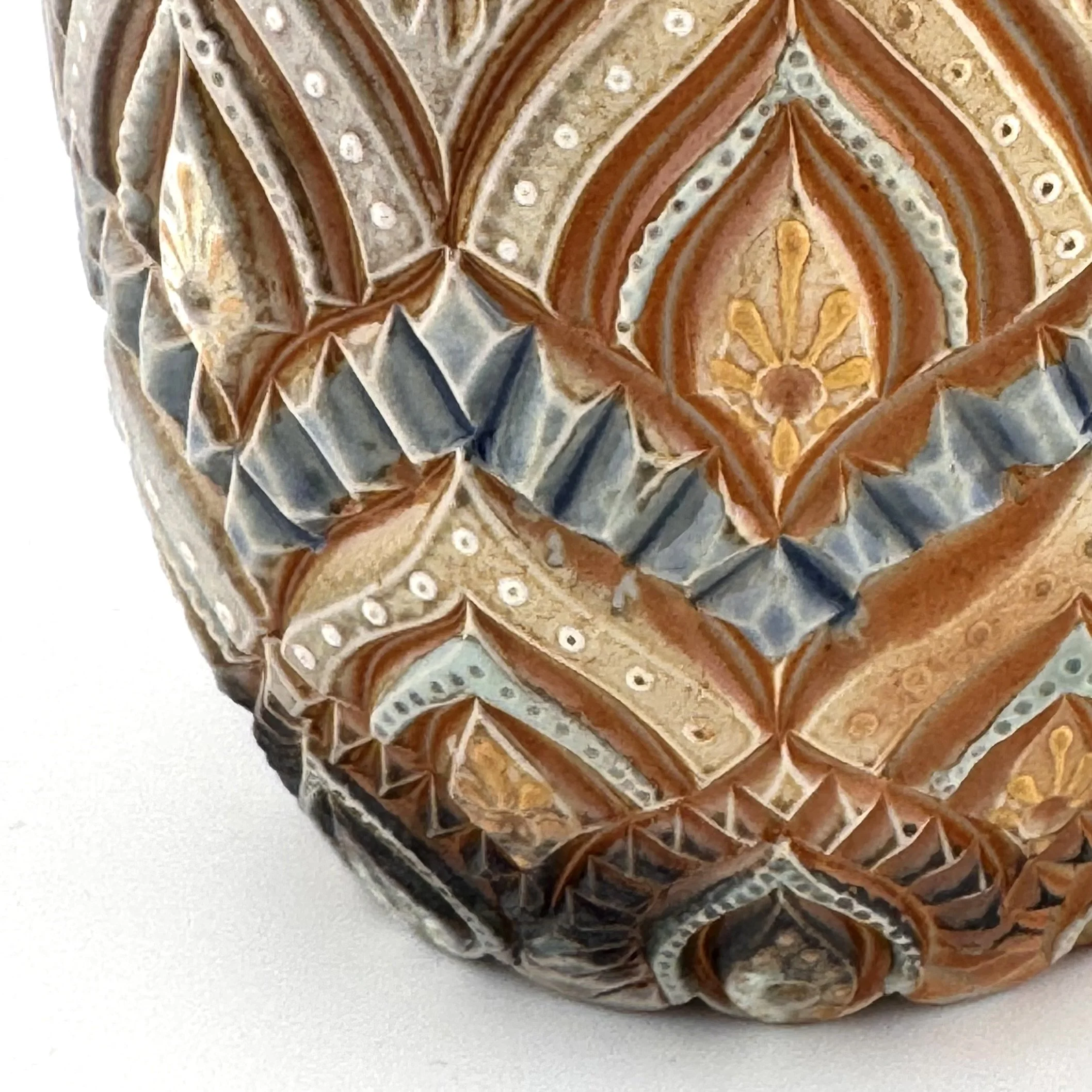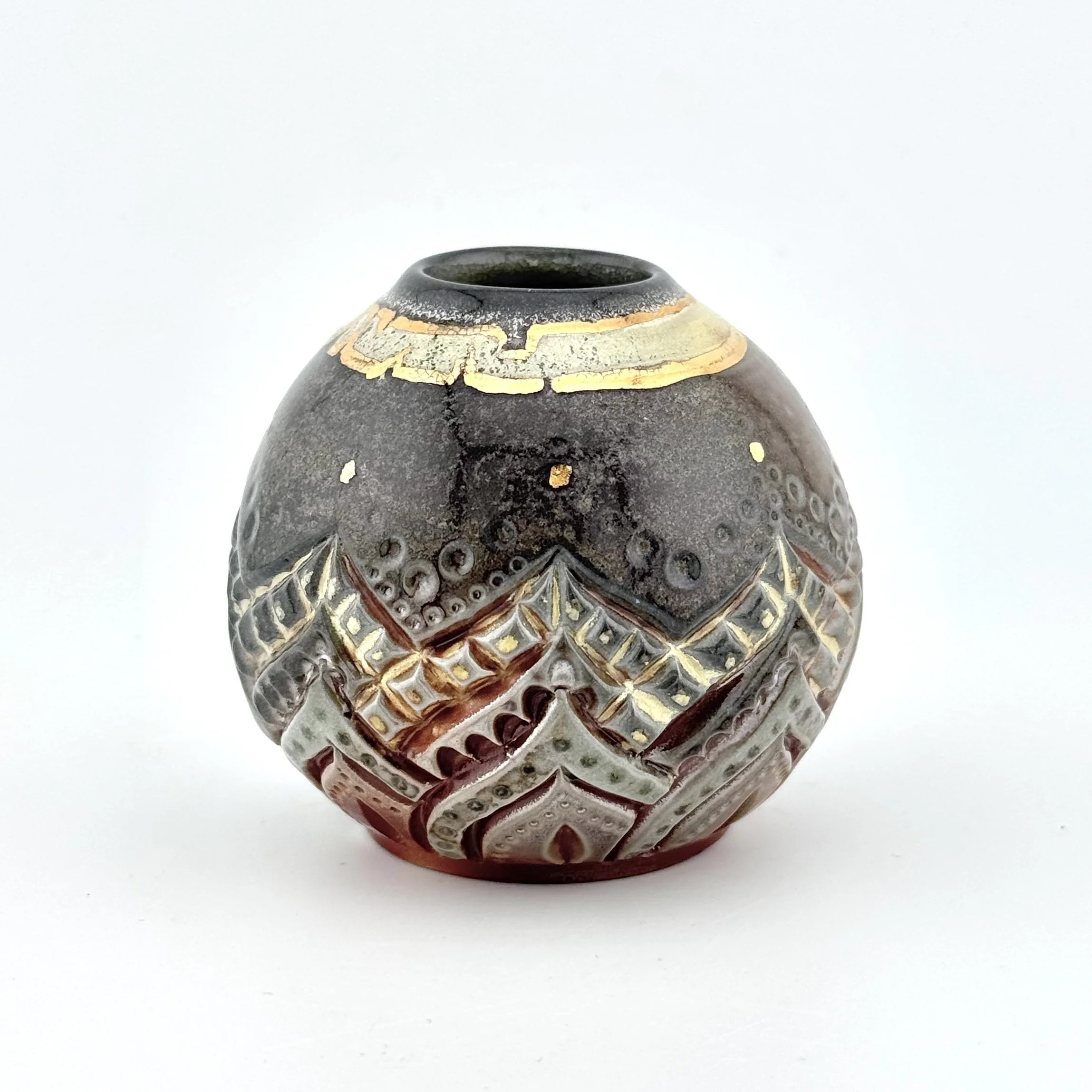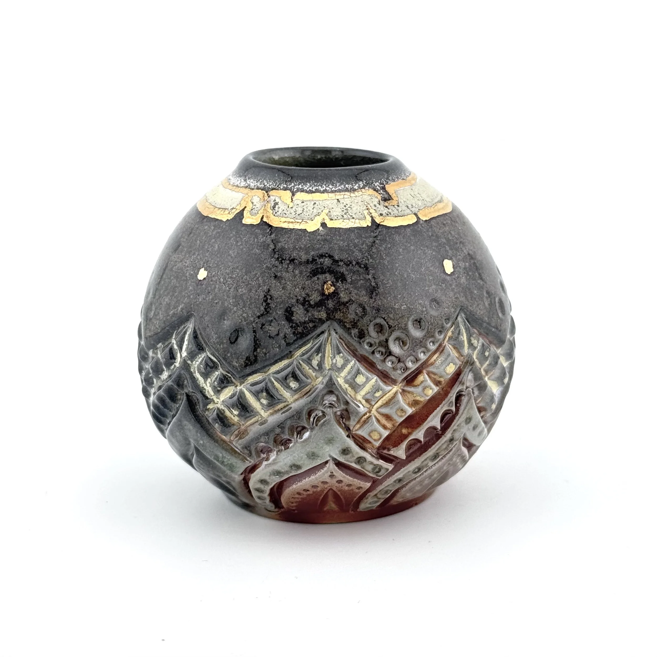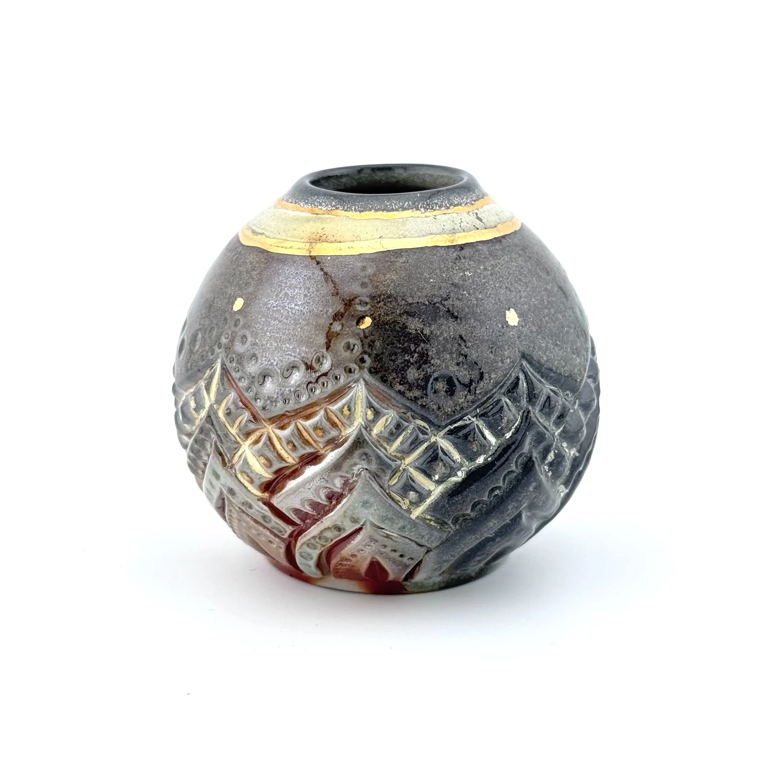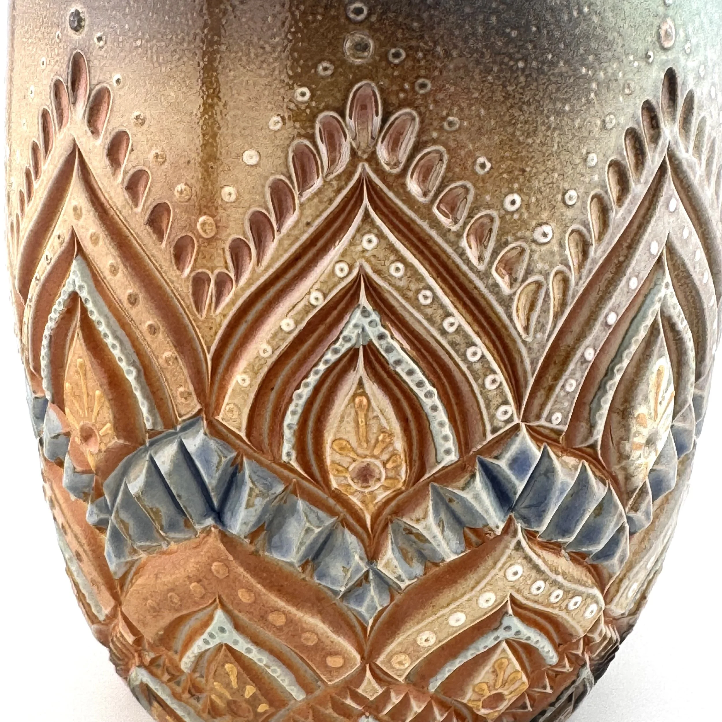 A dramatic addition to any home, this white hand carved vase was sprayed with a cobalt blue vase to accentuate it’s designs. The wide opening makes it perfect for any bouquet, and with or without flowers it’s a work of art on your table.