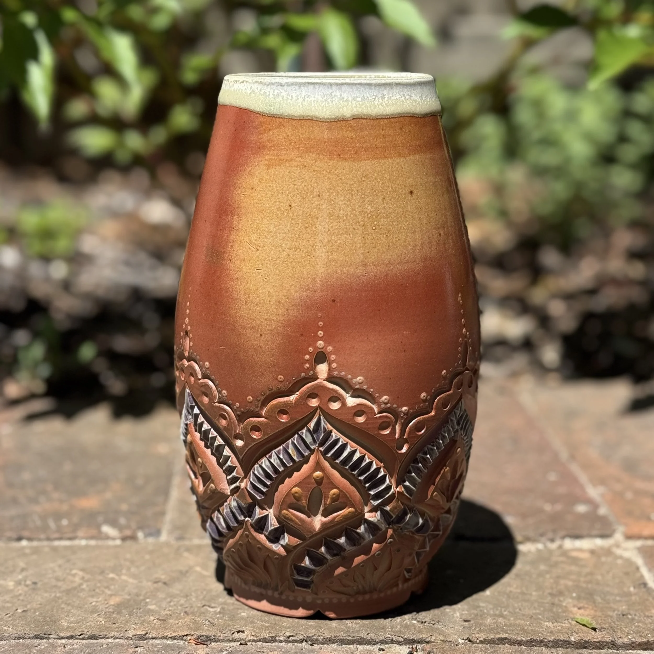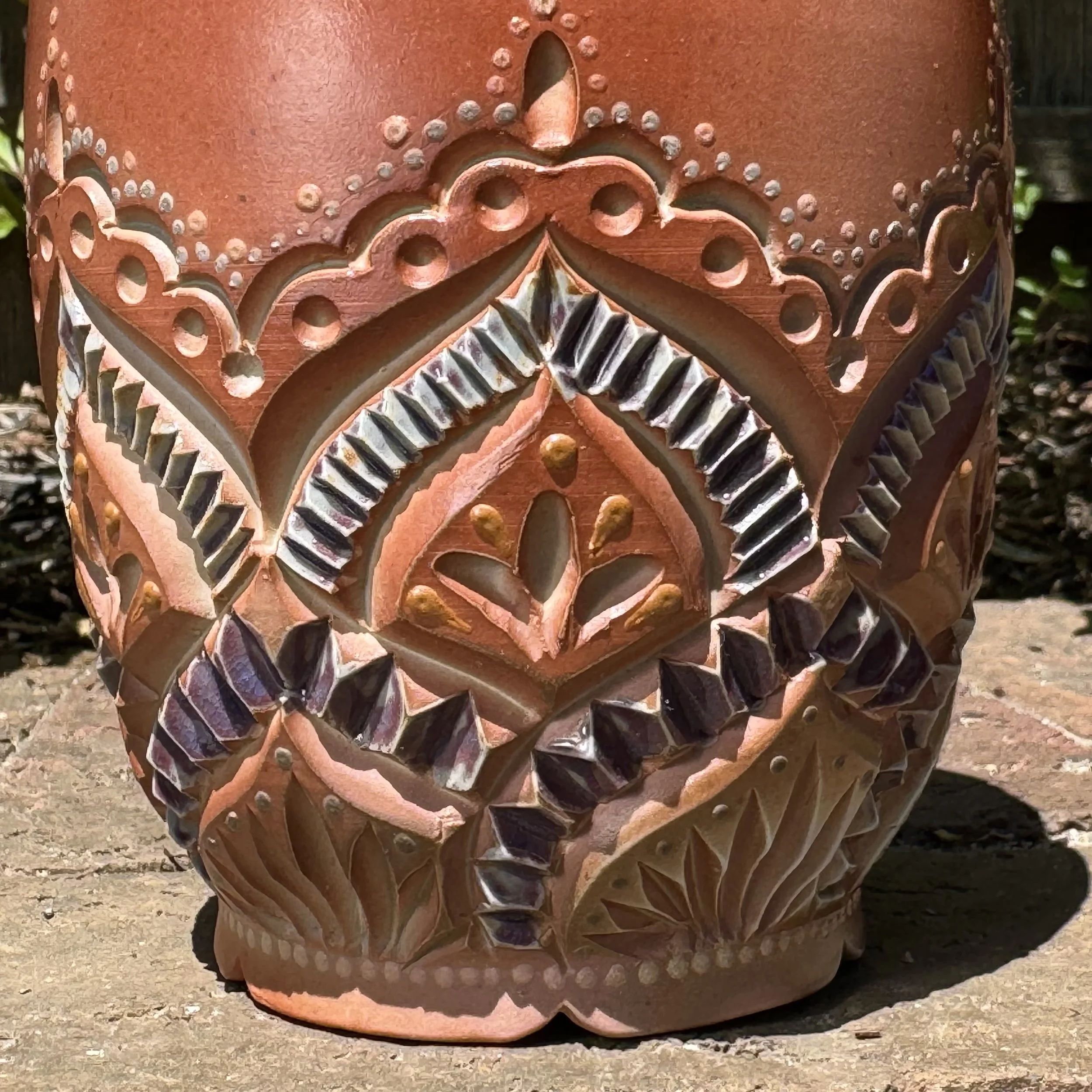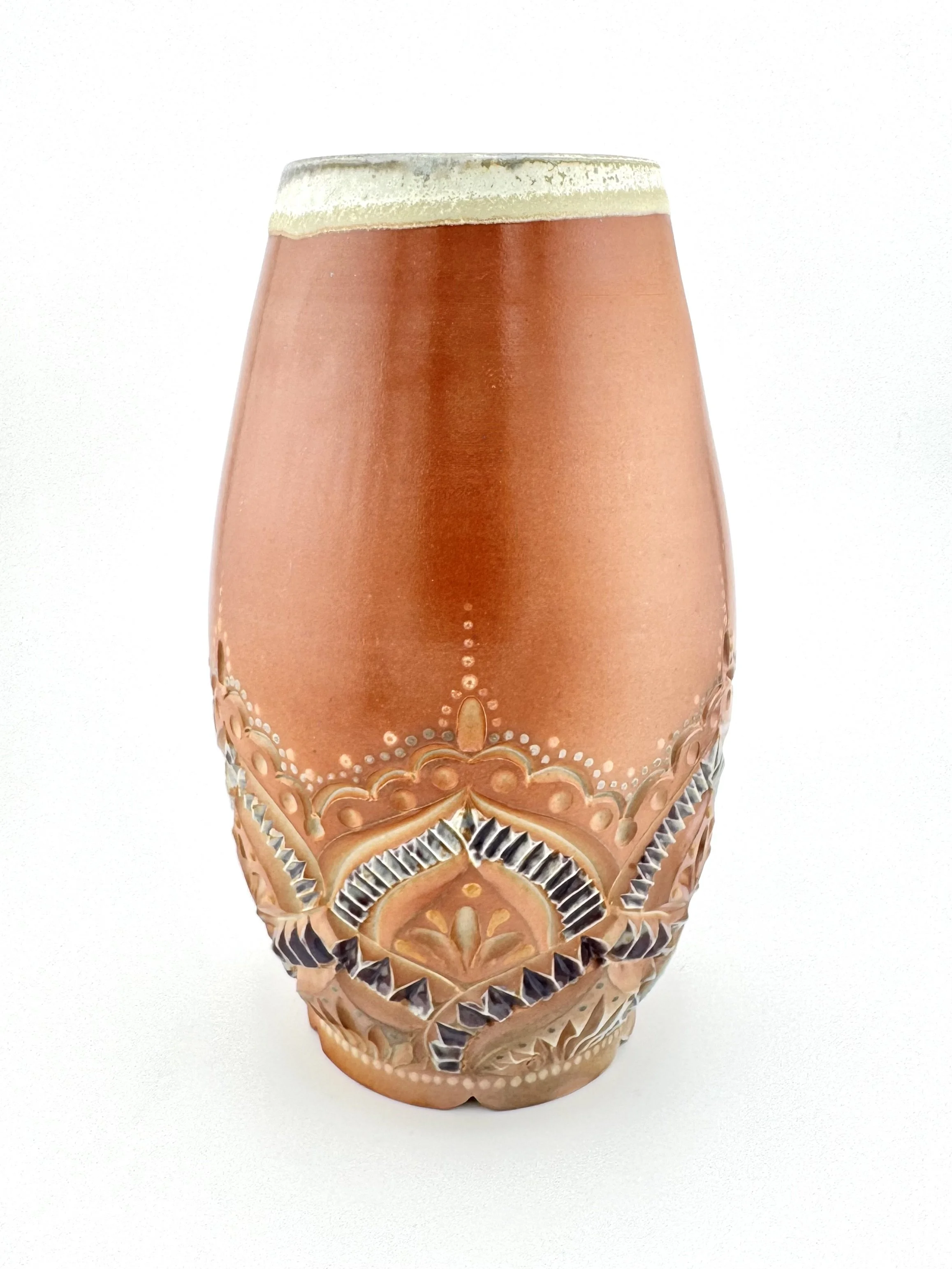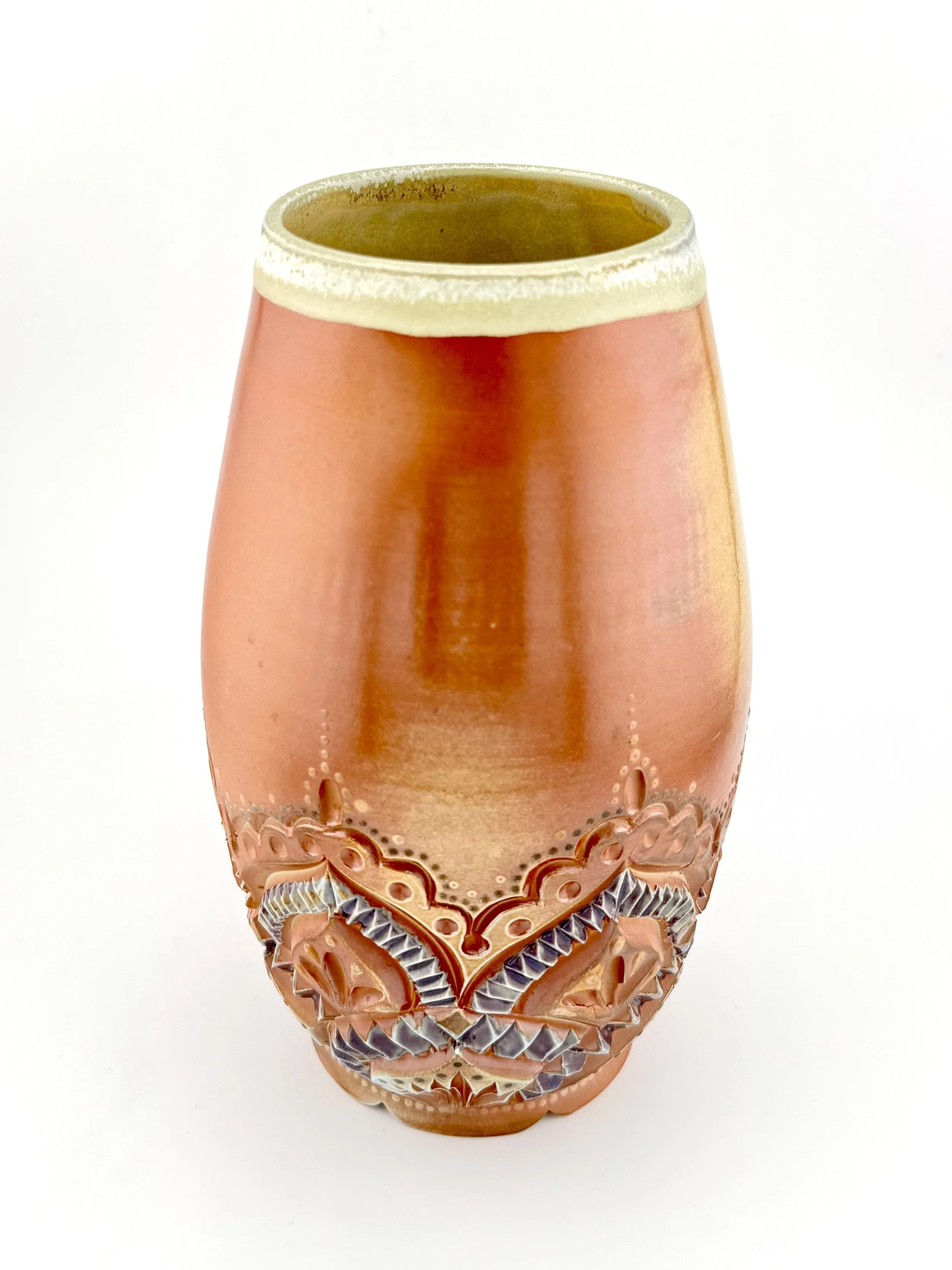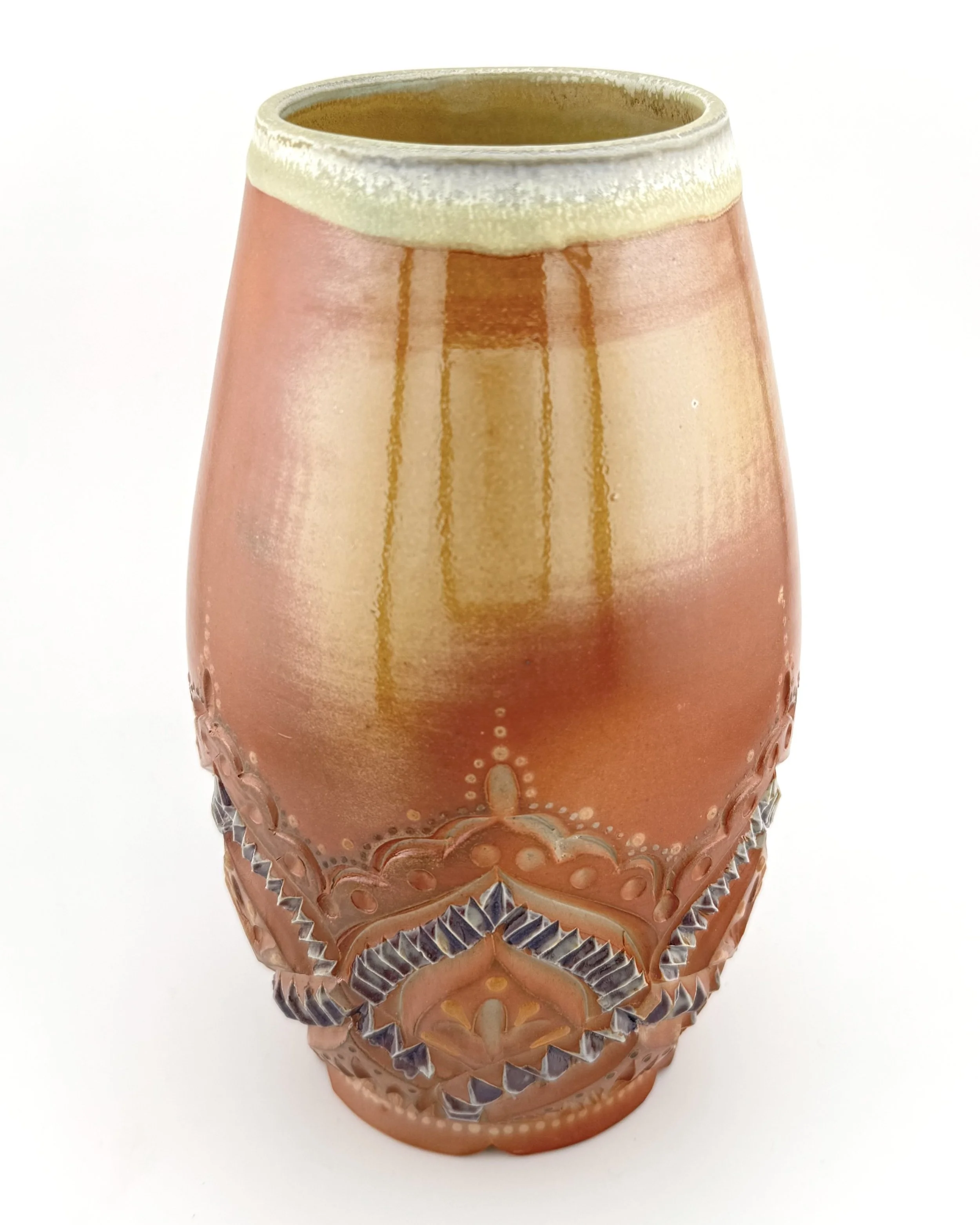 How wonderful is this round soda fired vase? Thrown with a nice big belly, it’s been deeply carved and decorated with porcelain slip and real 24K Gold luster. With its unique surface colors, interesting sheen variations, and selectively applied glazes, this one is sure to be art on your table. You could also put flowers in it. ;)