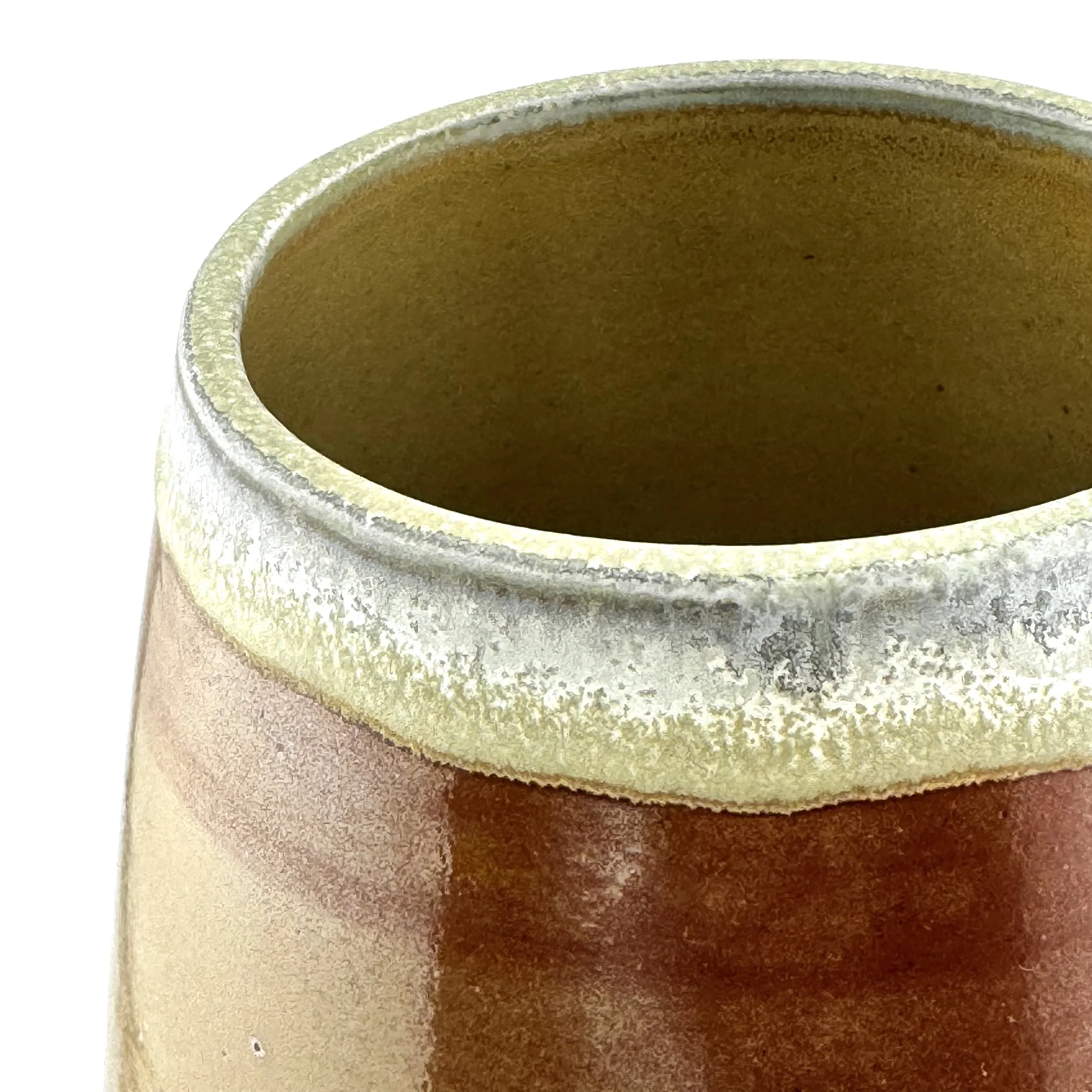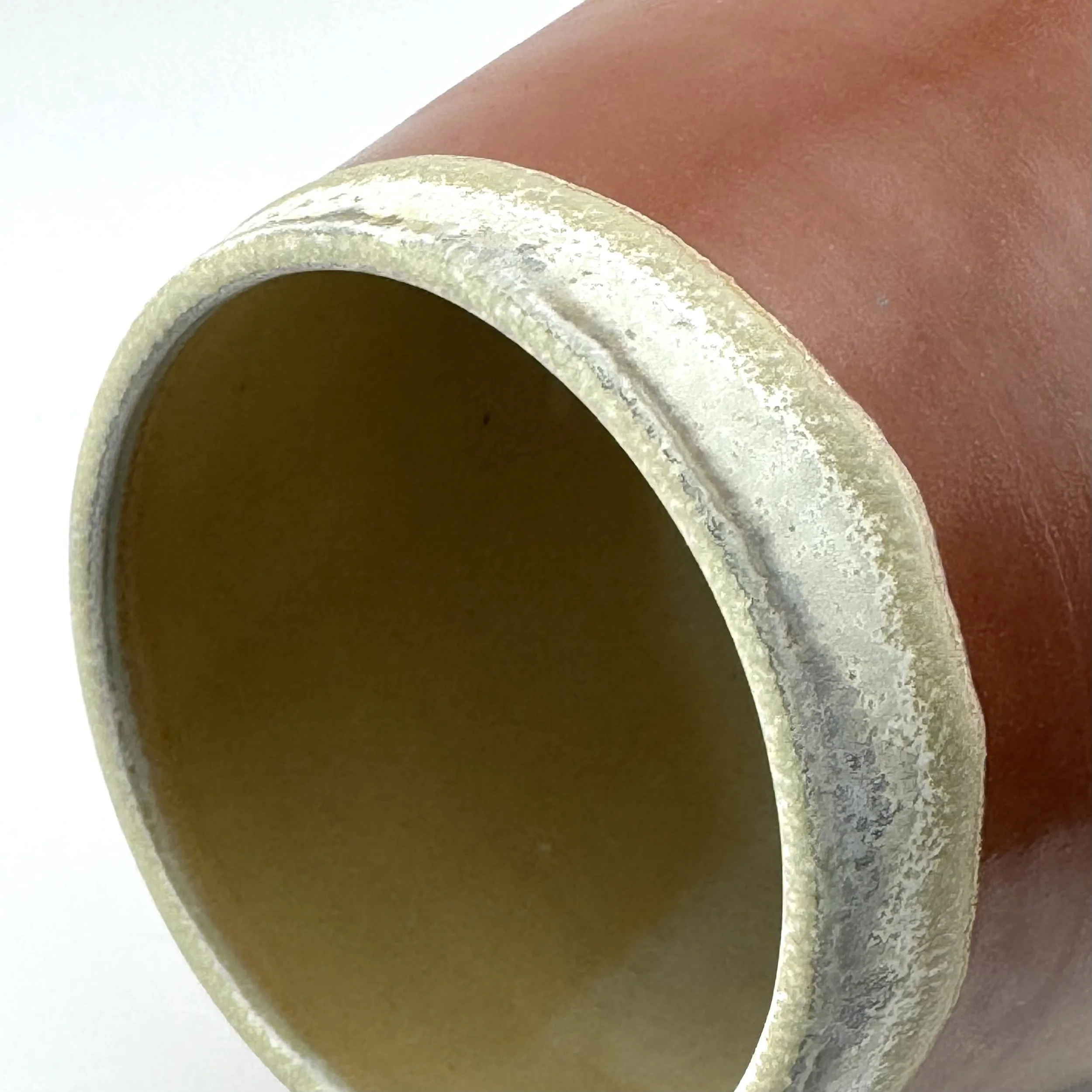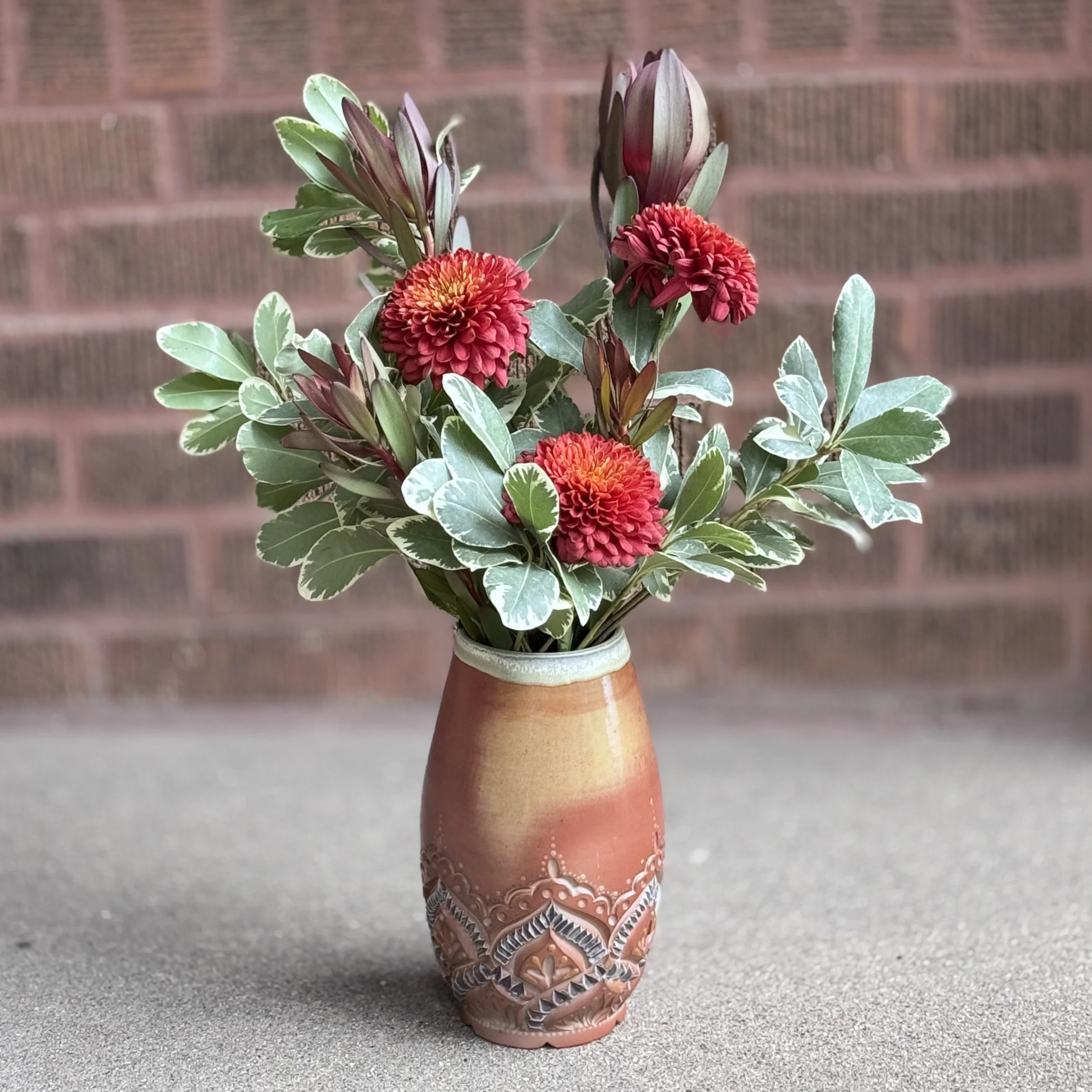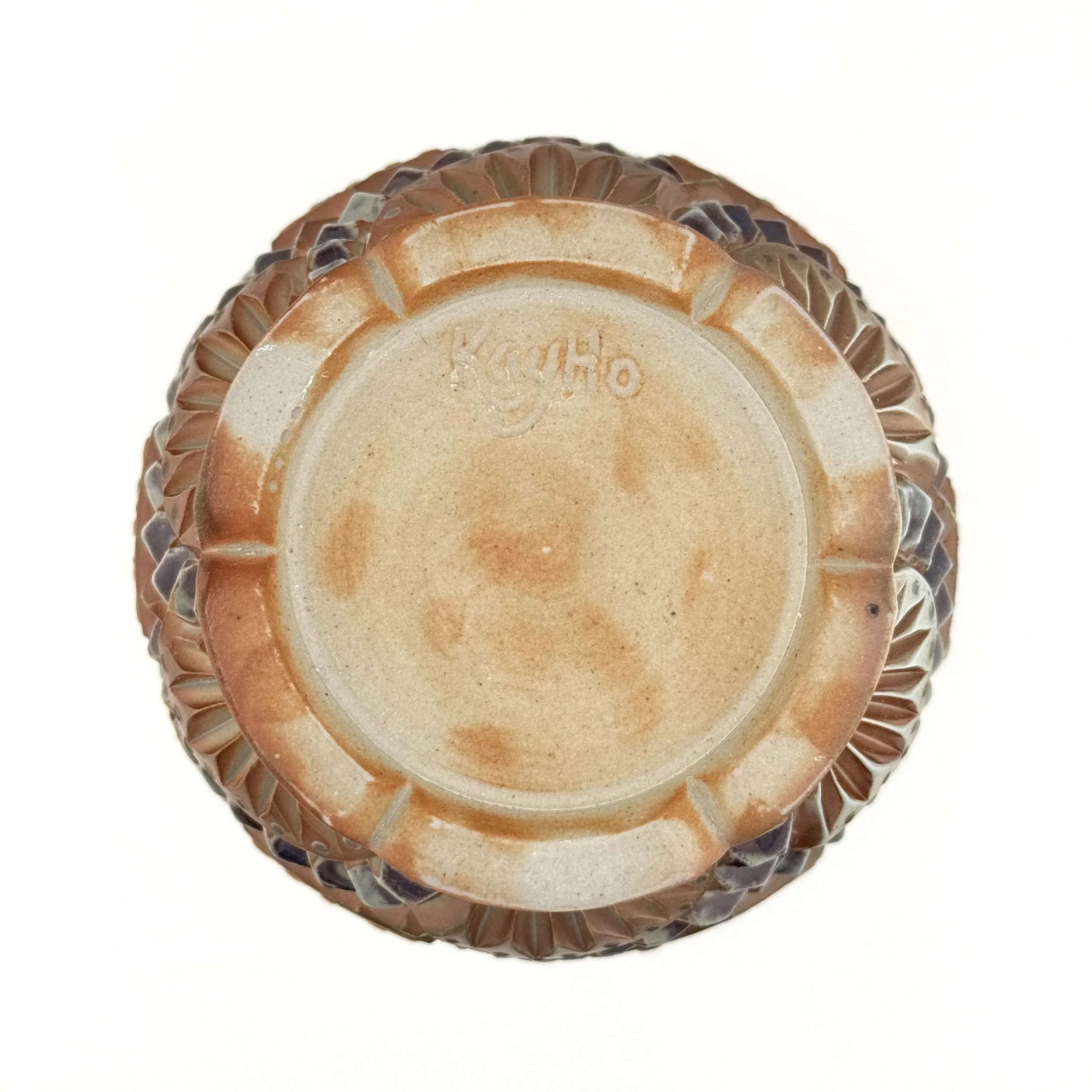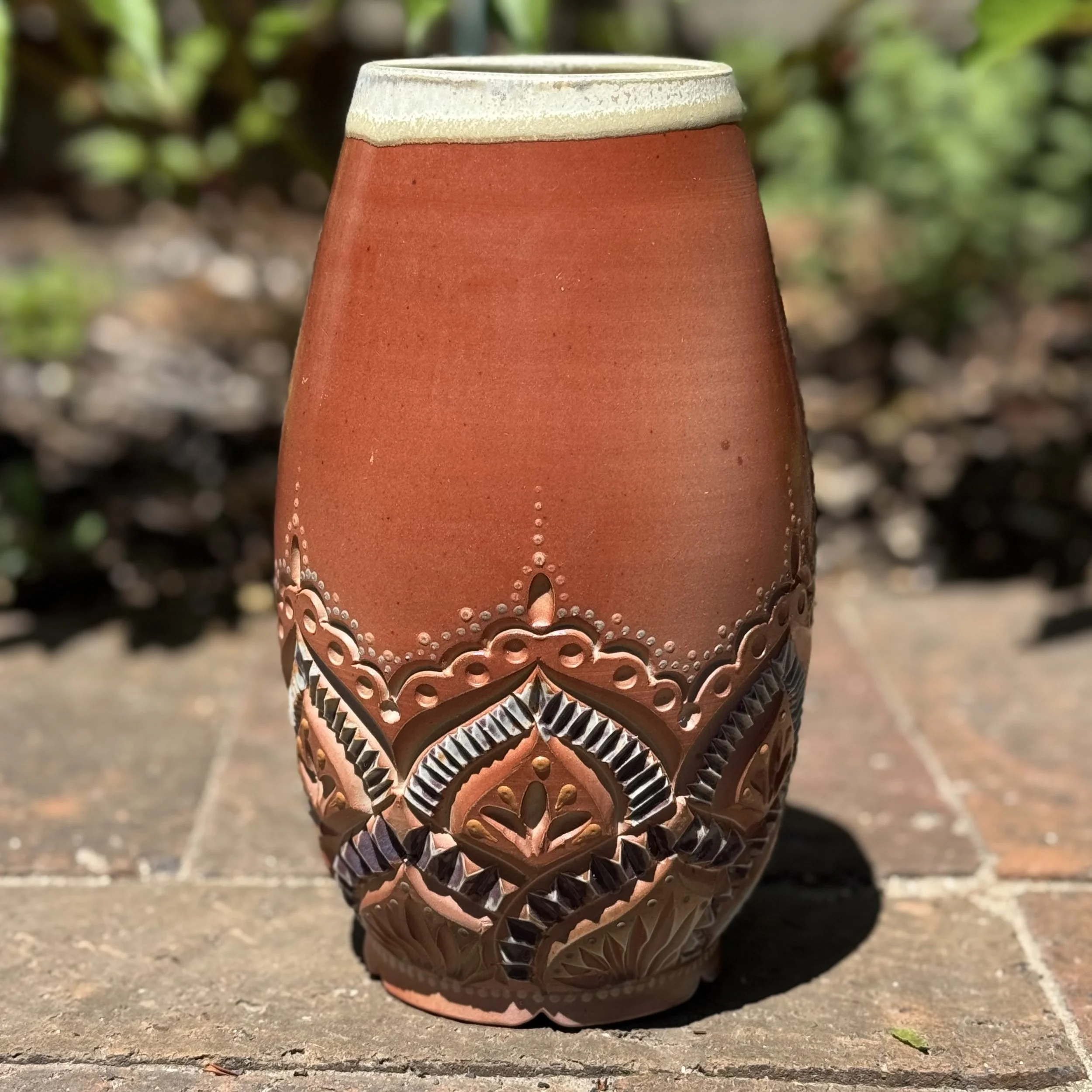 How wonderful is this round soda fired vase? Thrown with a nice big belly, it’s been deeply carved and decorated with porcelain slip and real 24K Gold luster. With its unique surface colors, interesting sheen variations, and selectively applied glazes, this one is sure to be art on your table. You could also put flowers in it. ;)