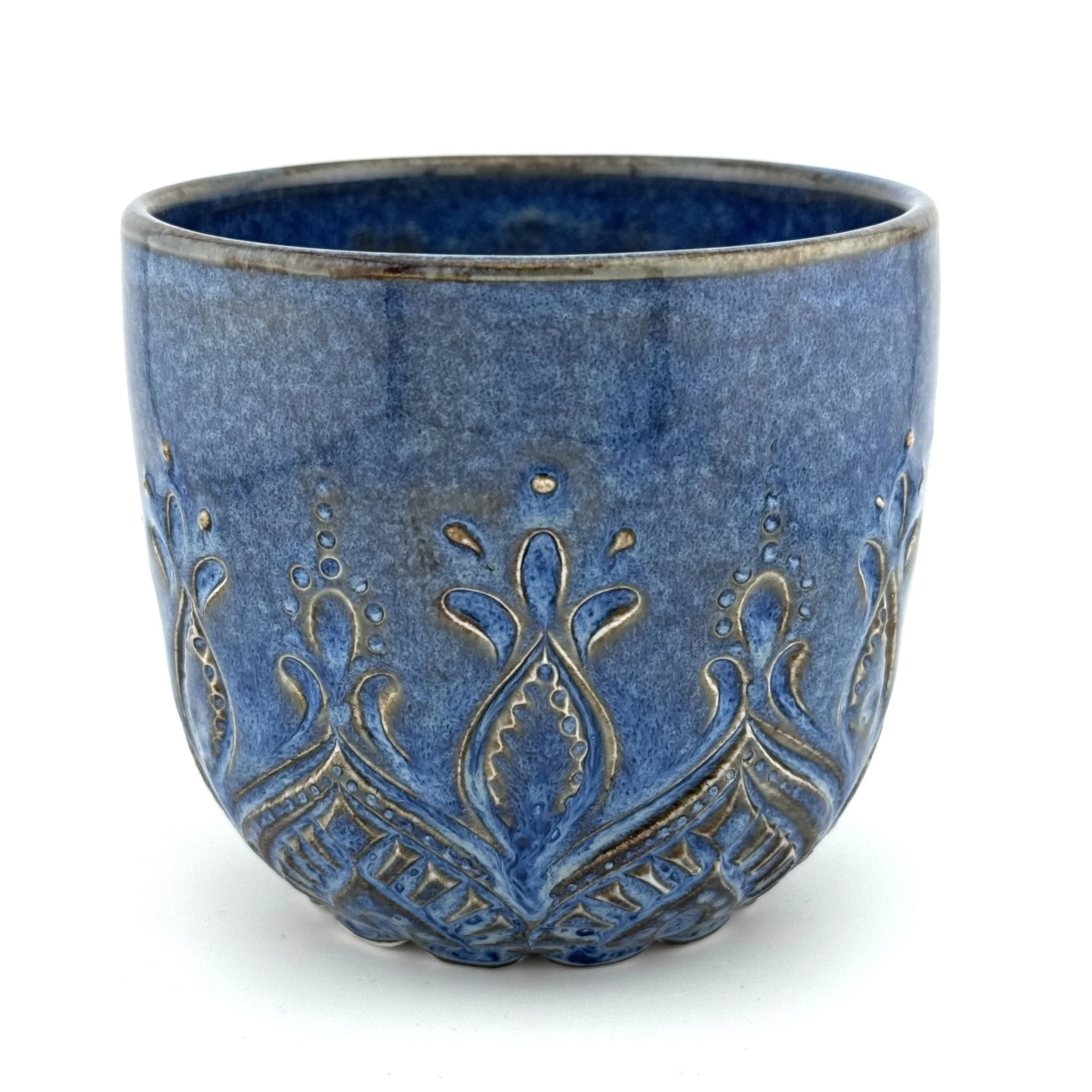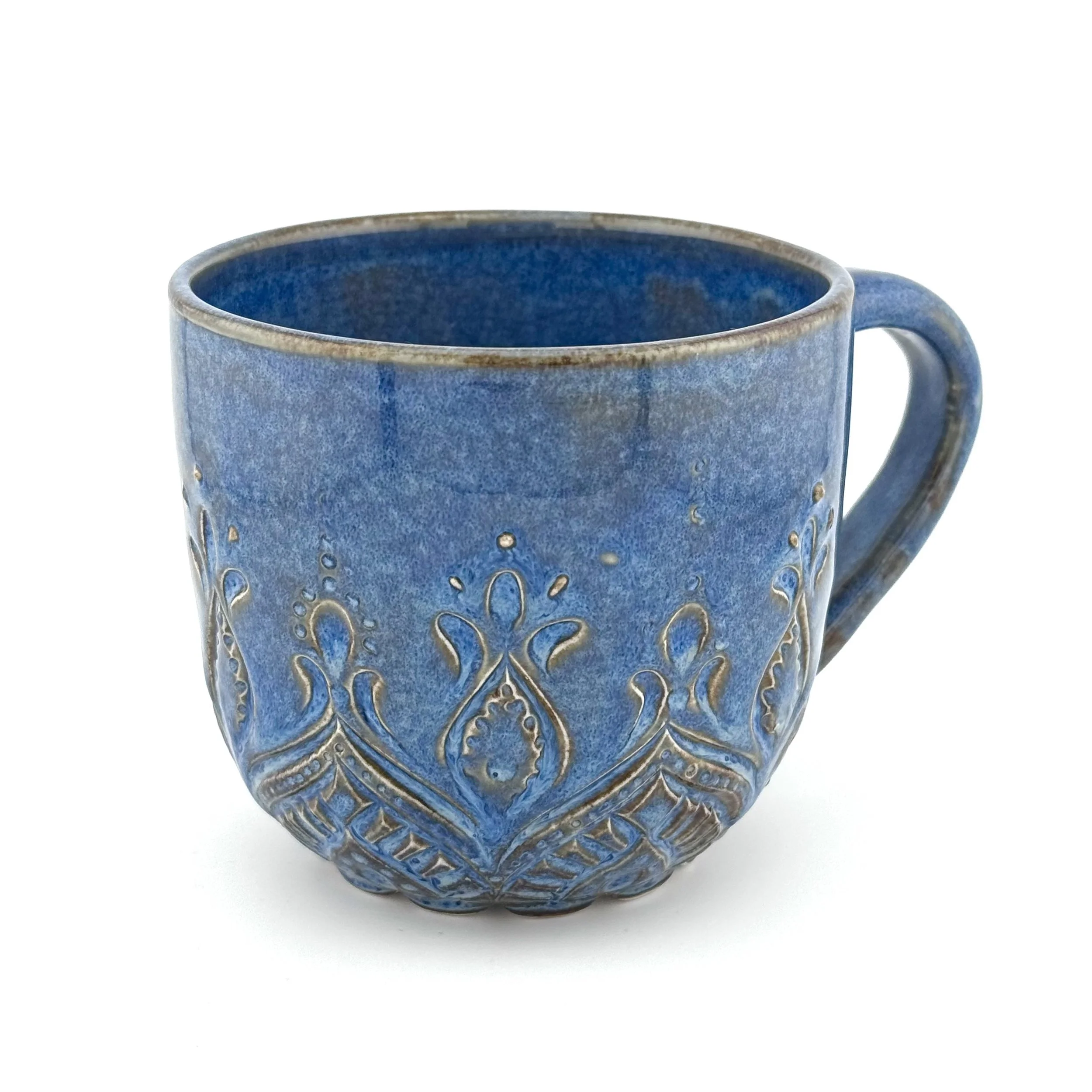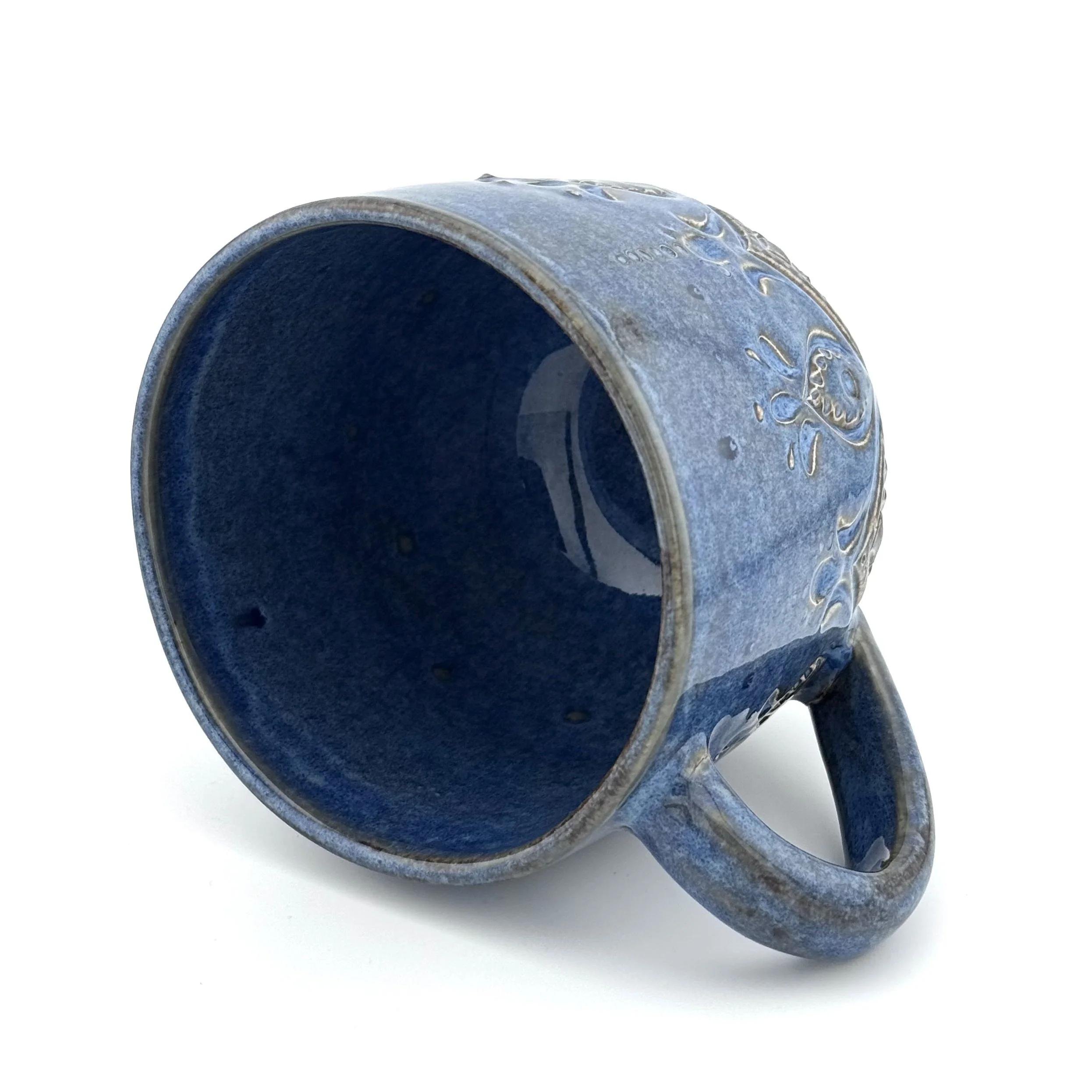 Hand carved and decorated with porcelain slip. The white glaze creates a smooth, shiny surface with a few little speckles here and there, while the slip details and carvings offer a great tactile quality. Interior is also glazed white. Perfect for coffee, or when you want to see how darkly brewed your tea has become.