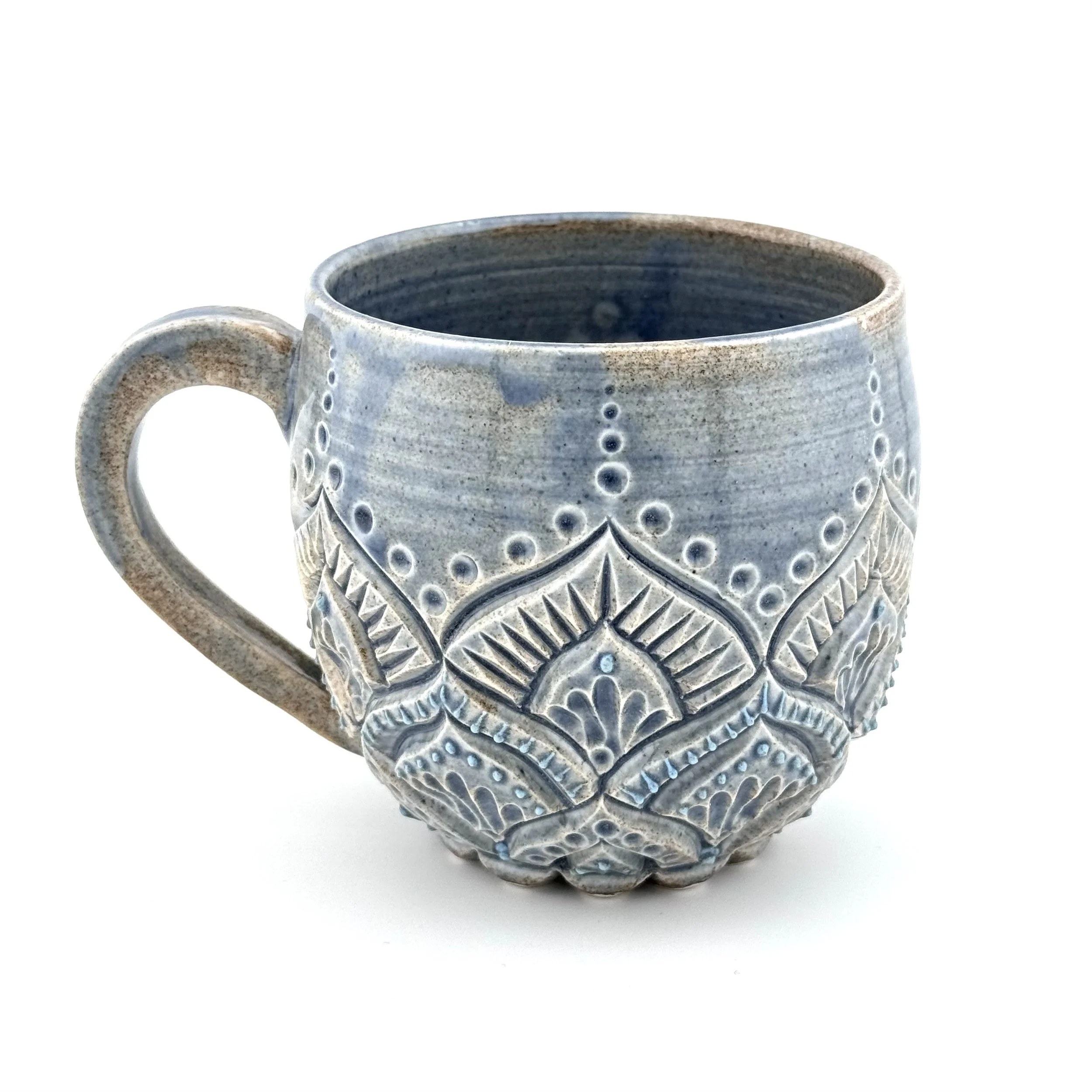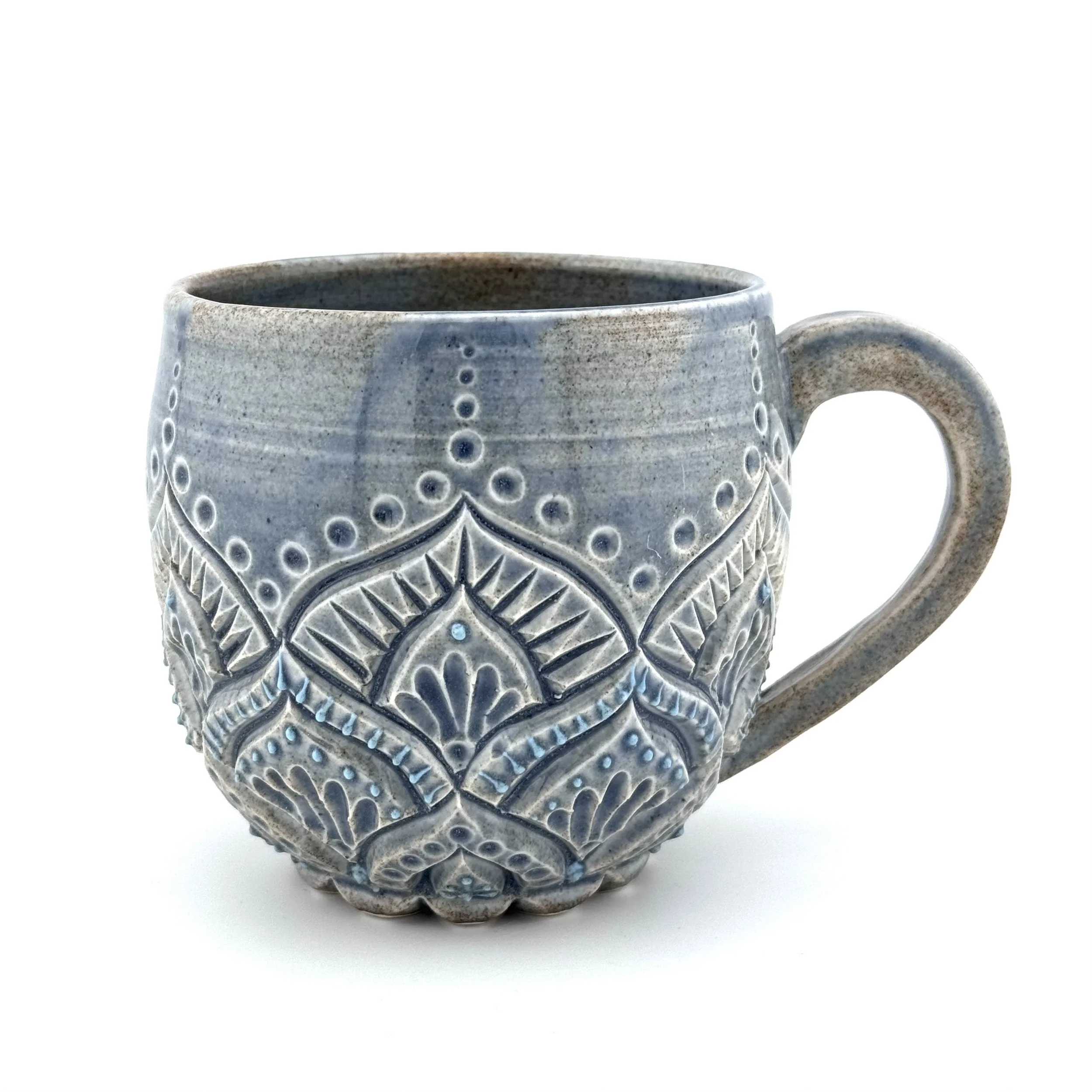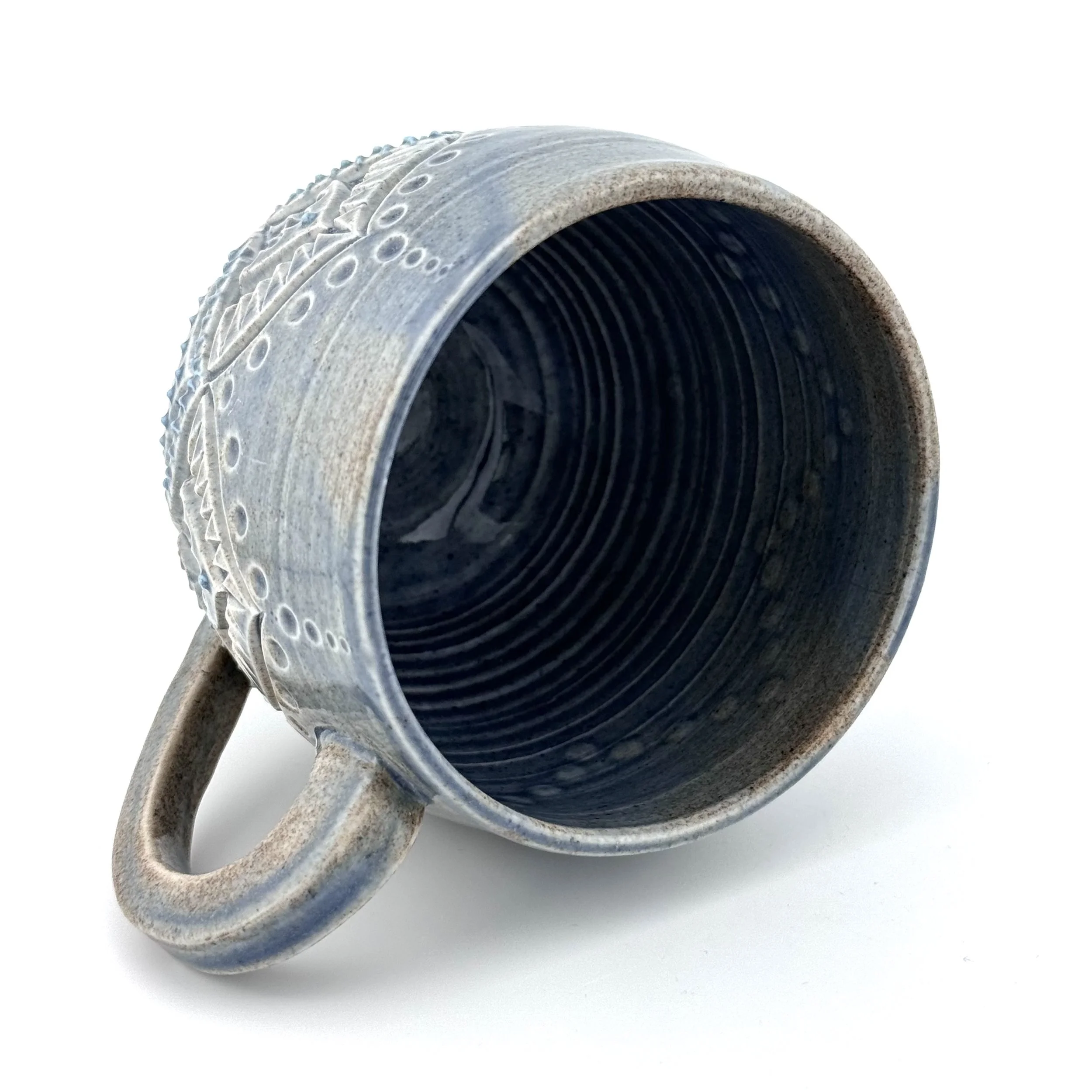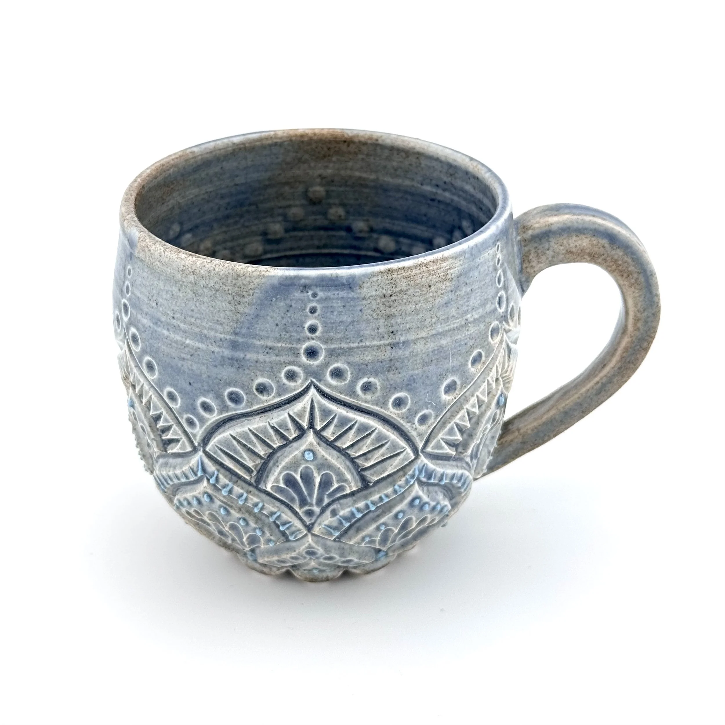 Hand carved and decorated with a sky blue porcelain slip, this mug has a great tactile quality. Where the glaze is thinnest, the clay shows through as a speckled tan, and where thicker its a deep denim blue. Enjoy with your coffee, or beverage of choice!