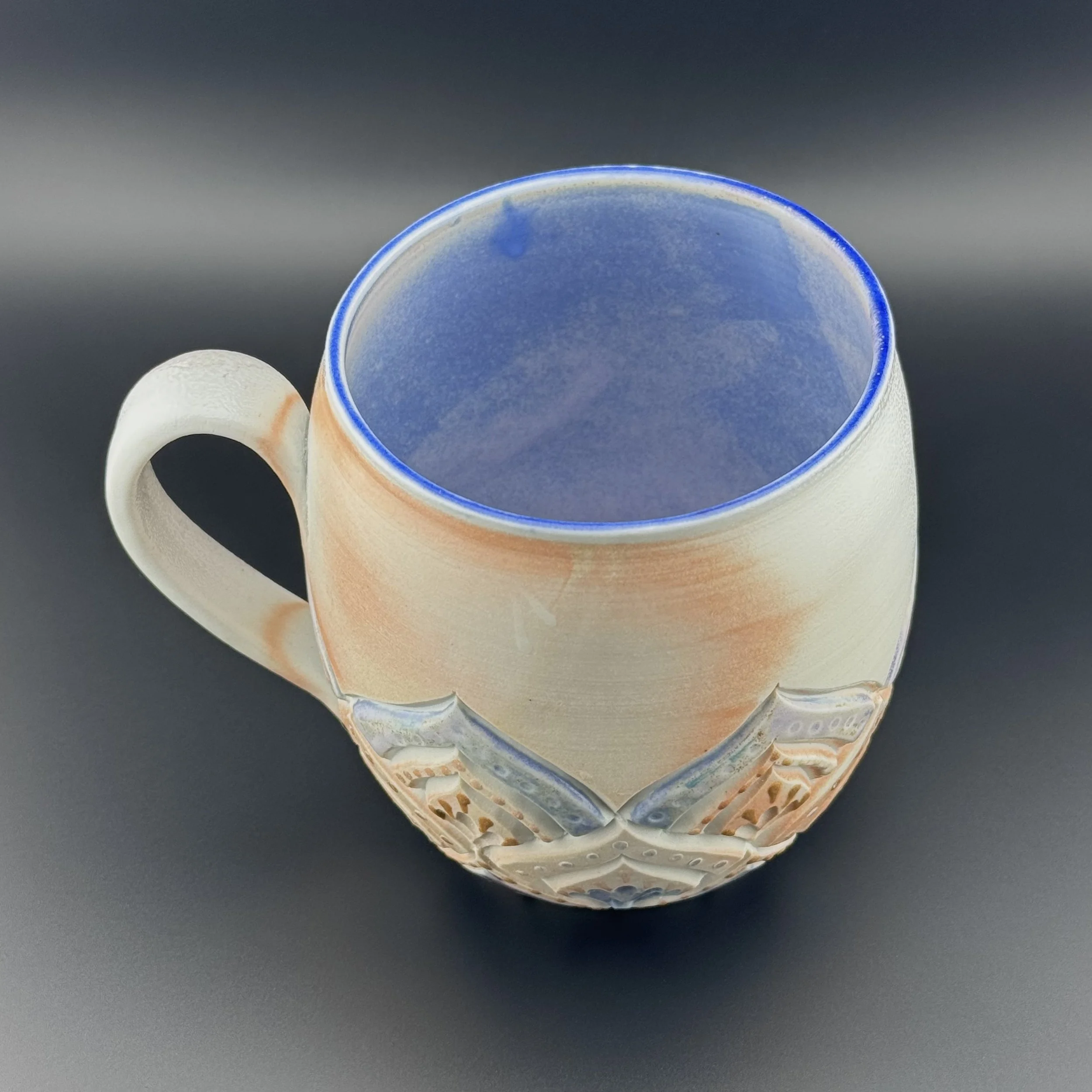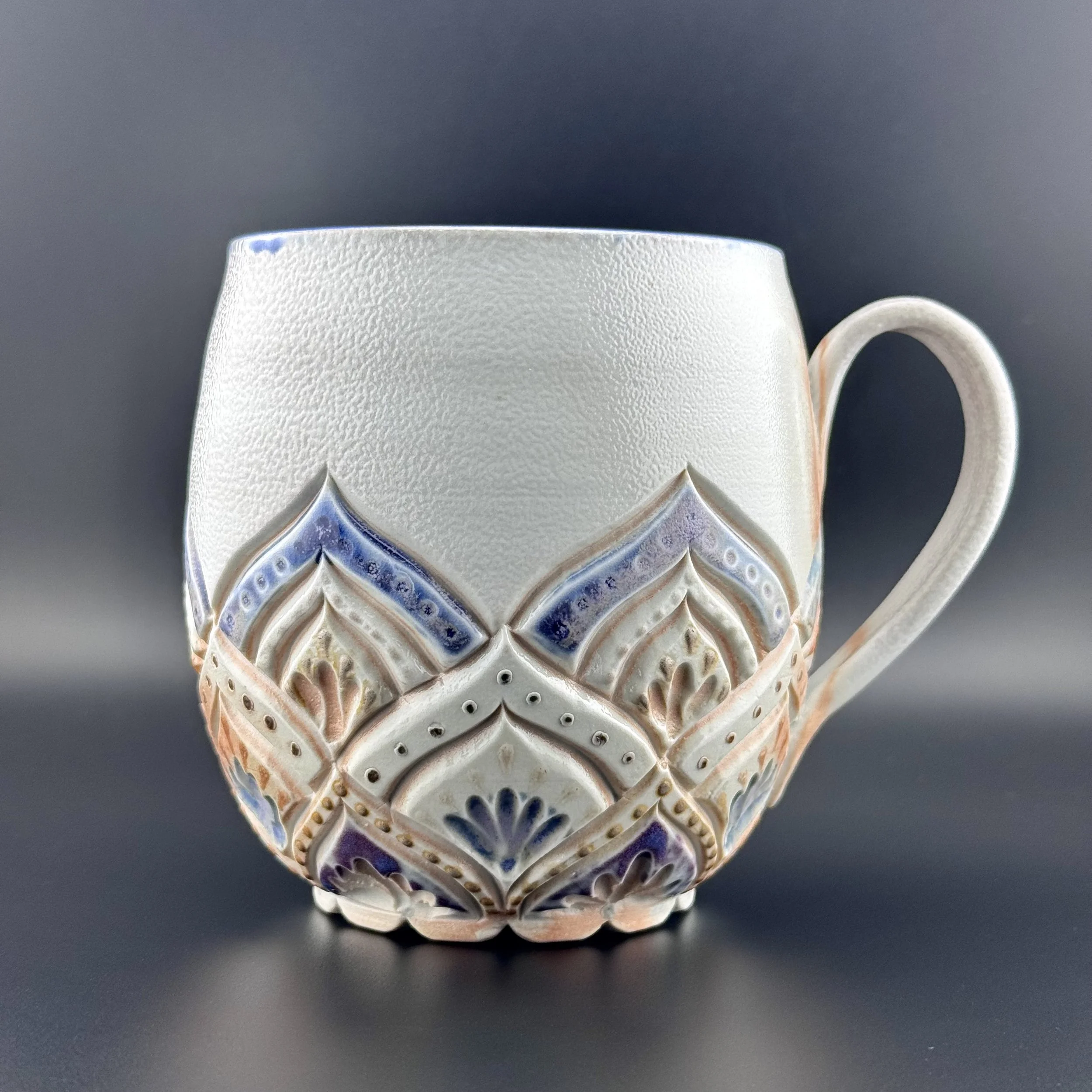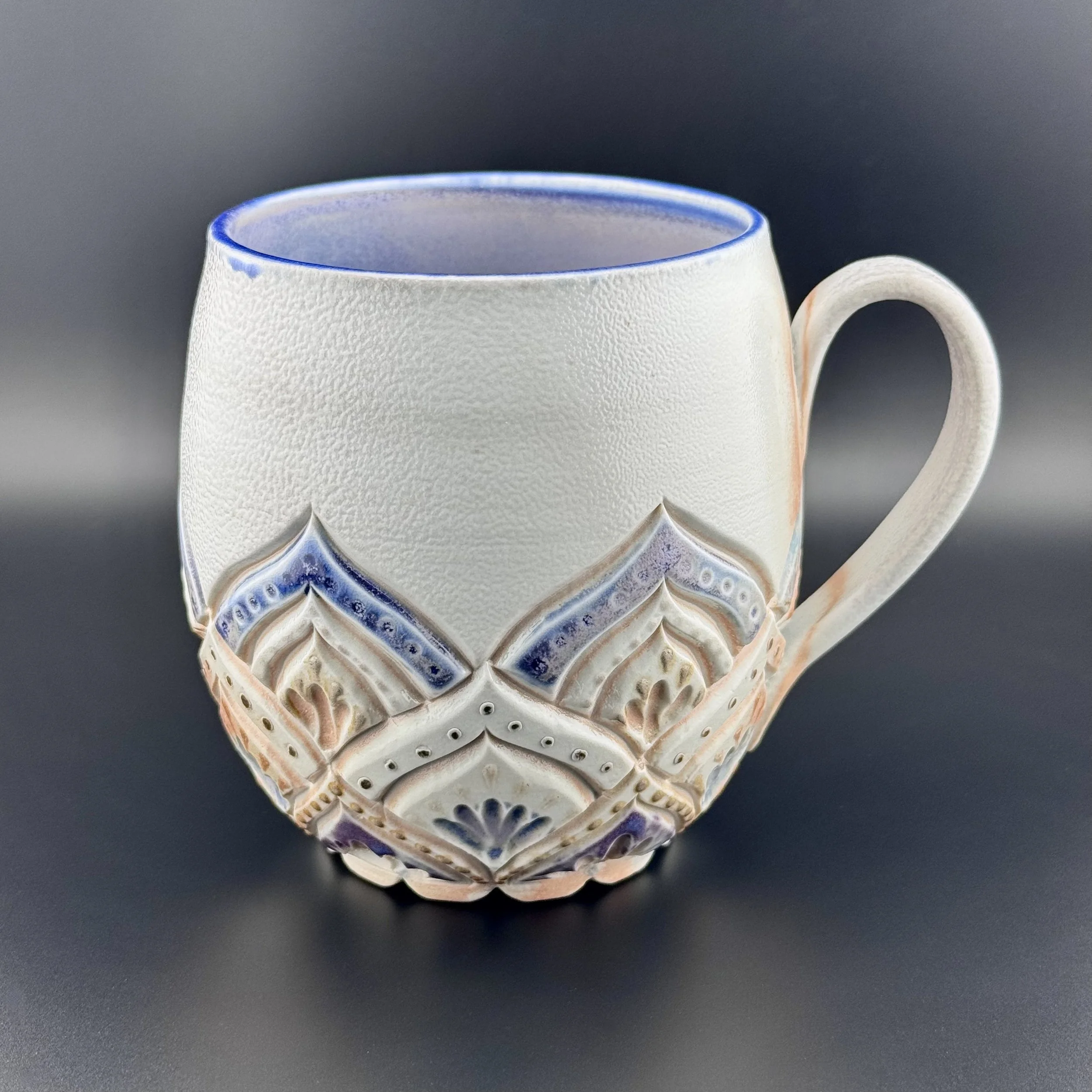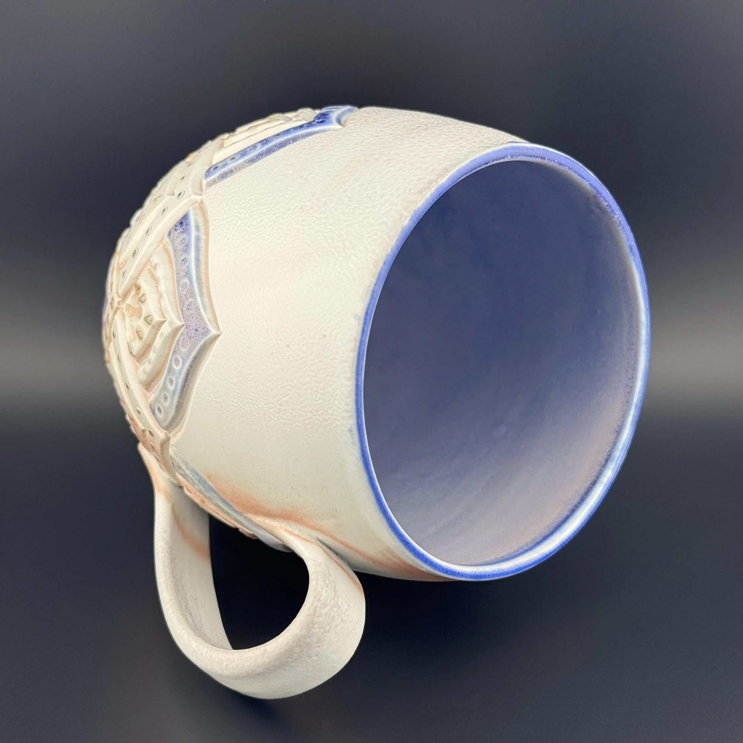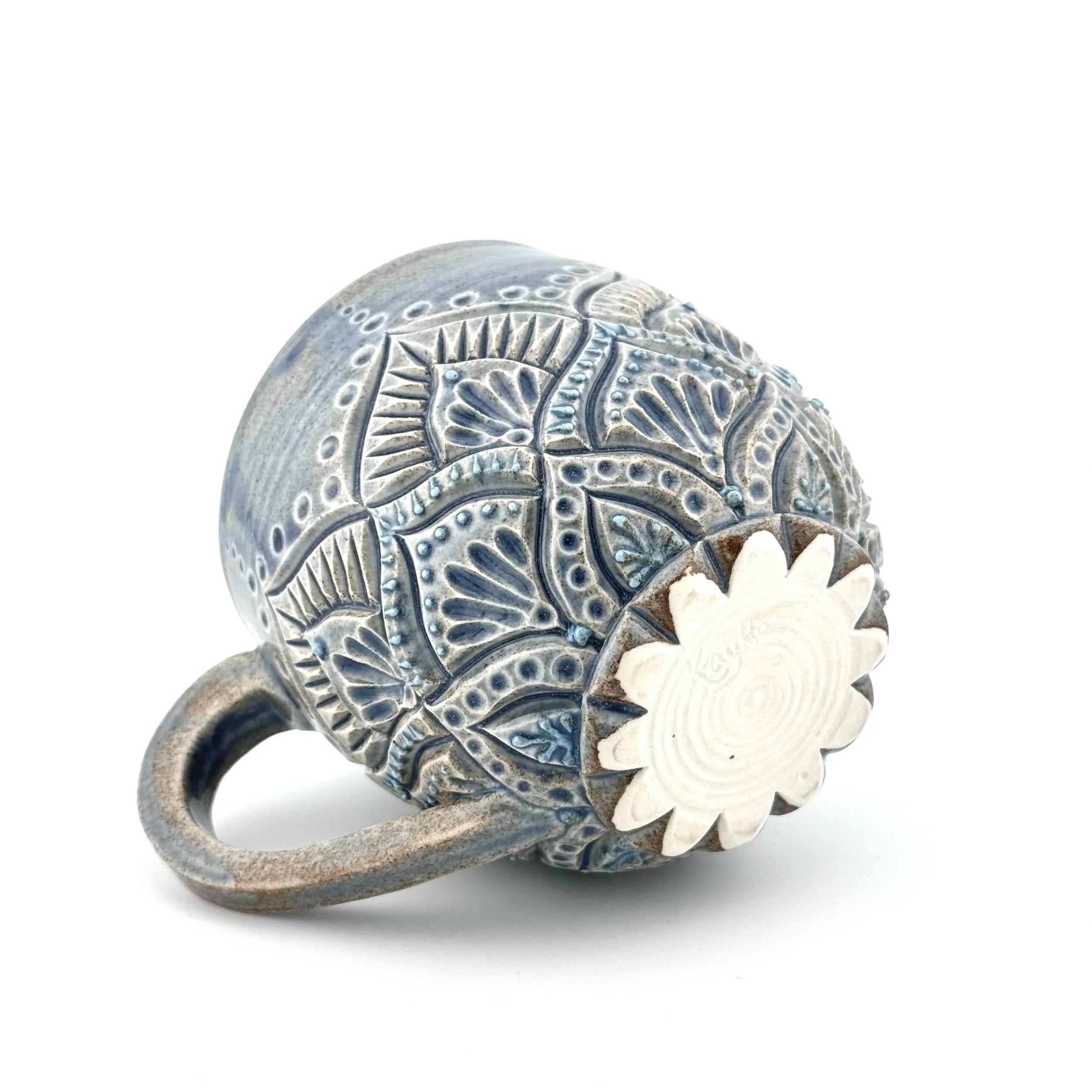 Hand carved and decorated with a sky blue porcelain slip, this mug has a great tactile quality. Where the glaze is thinnest, the clay shows through as a speckled tan, and where thicker its a deep denim blue. Enjoy with your coffee, or beverage of choice!