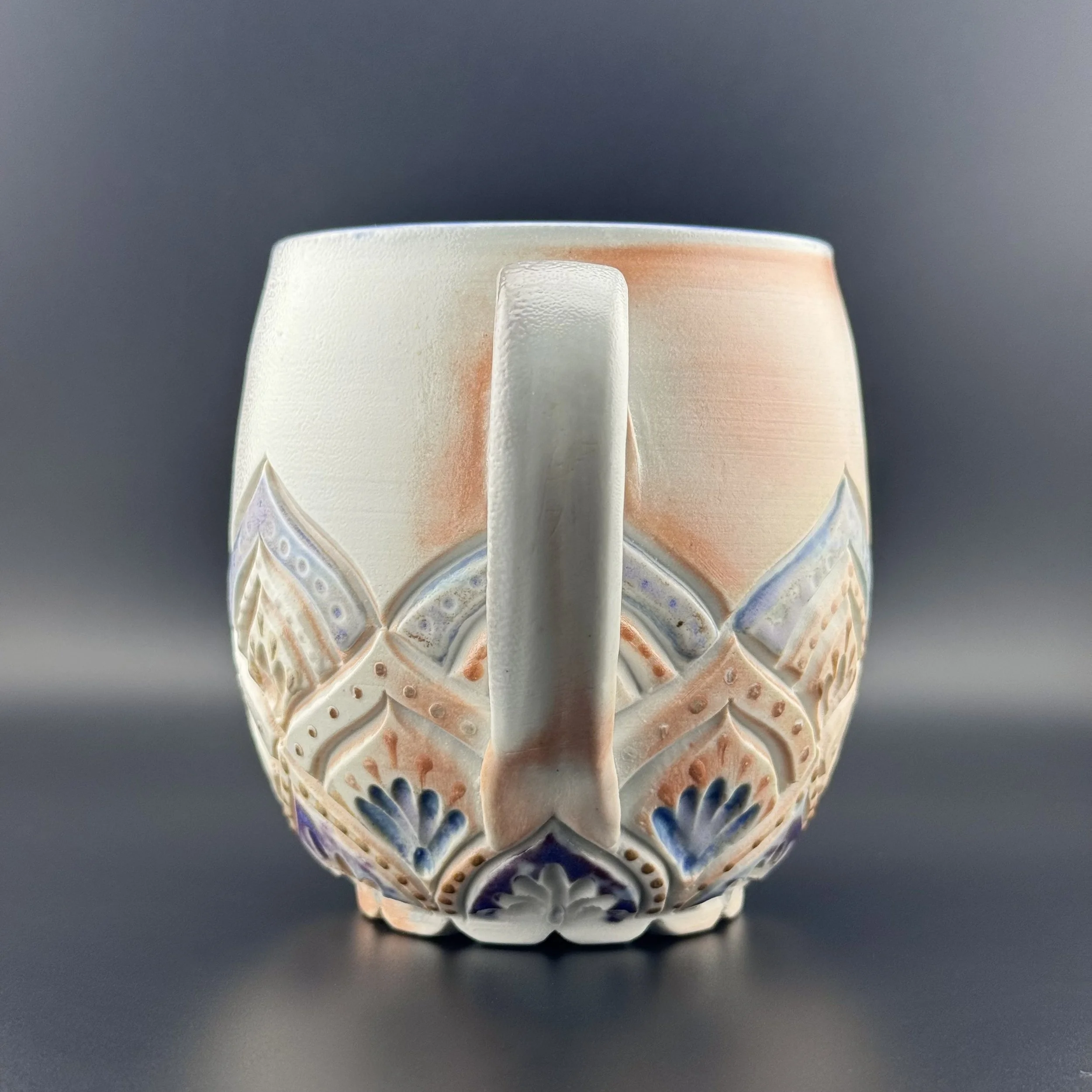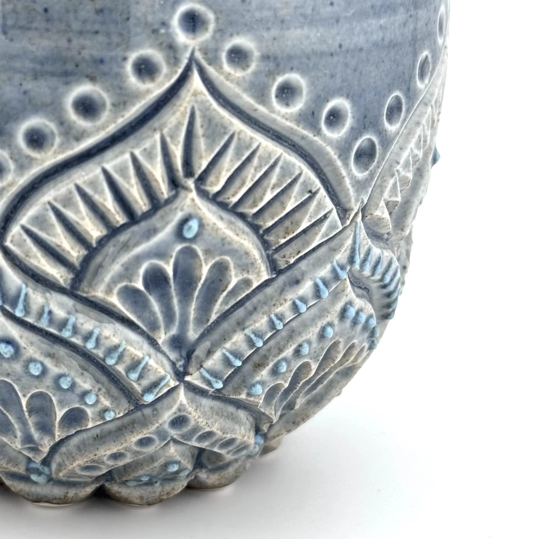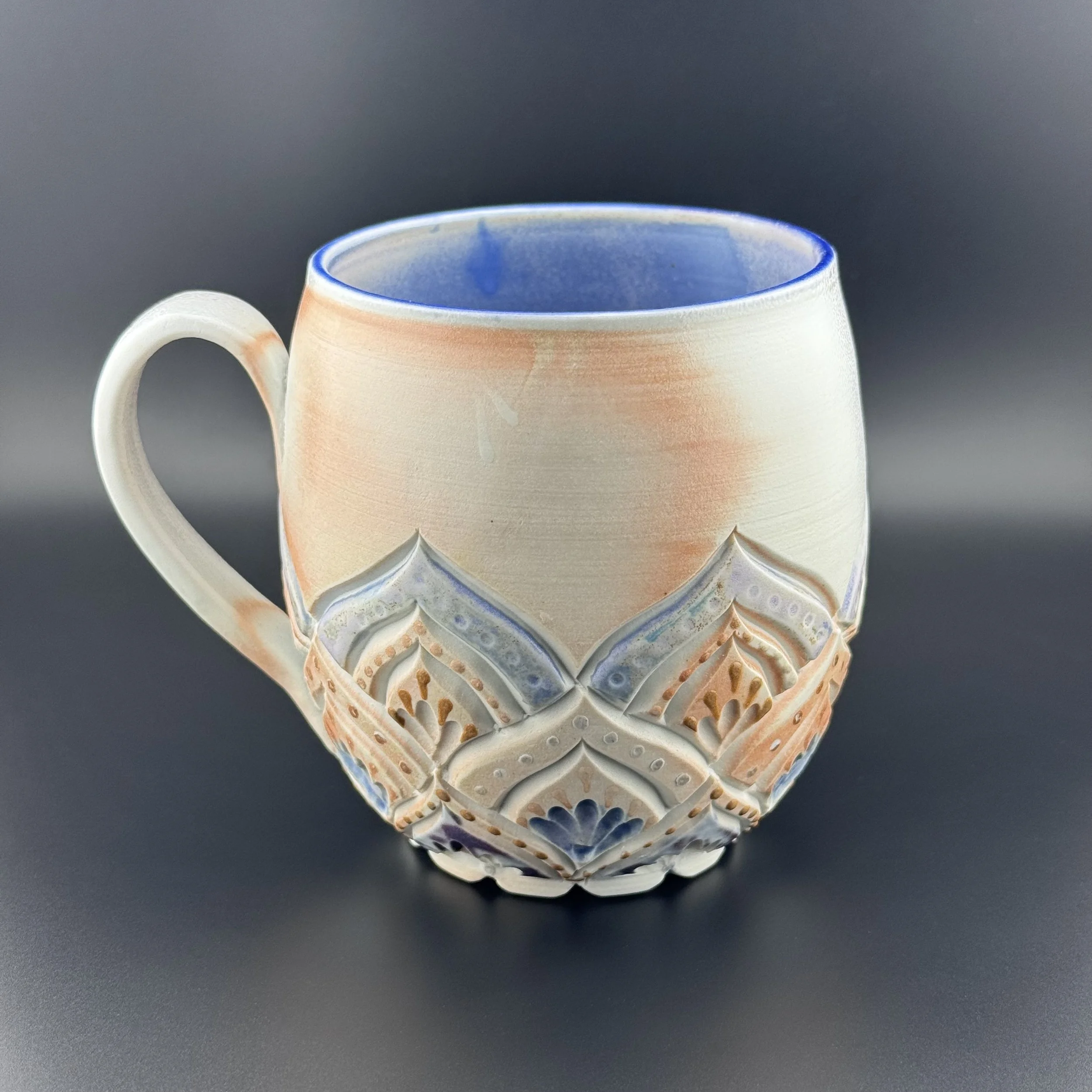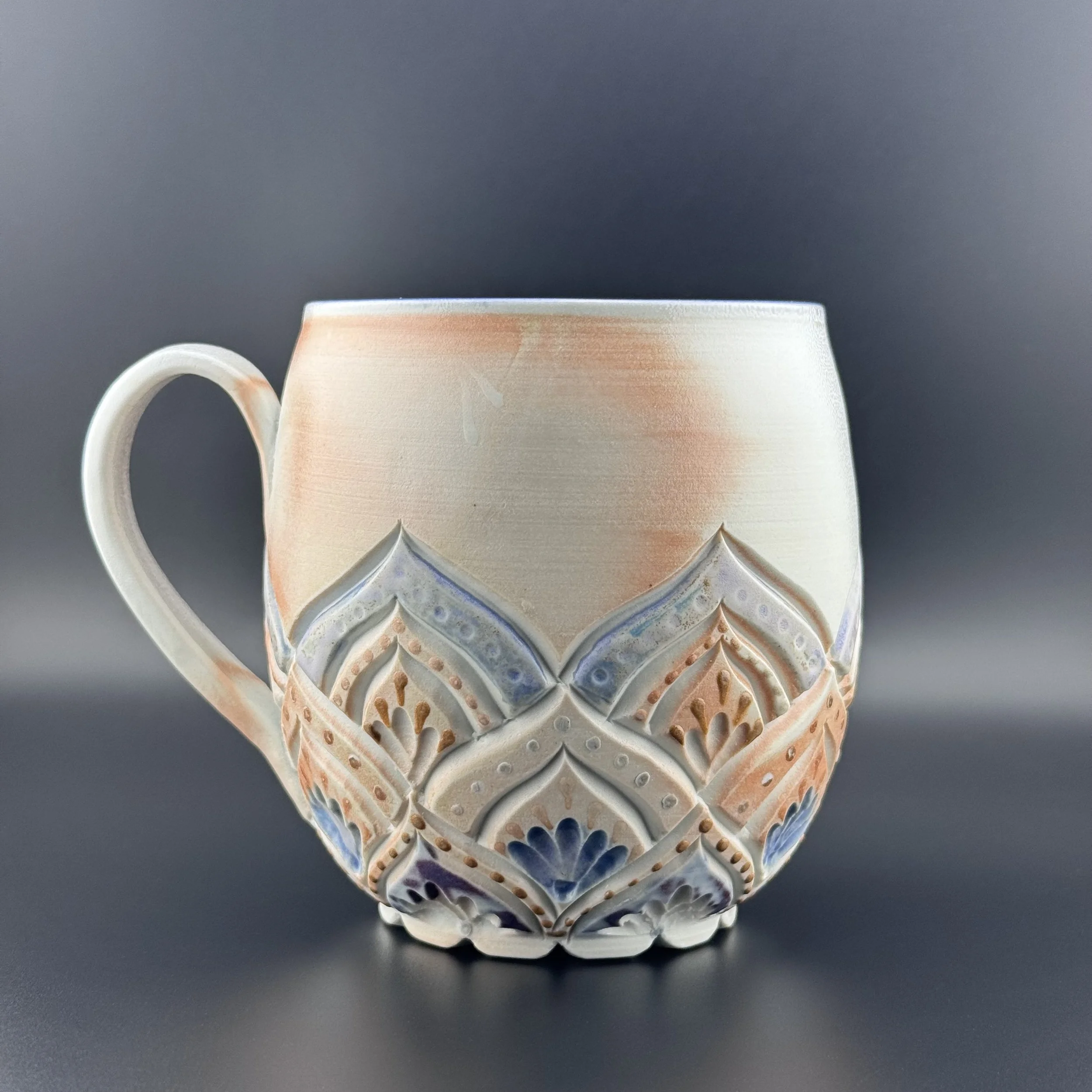 Hand carved and decorated with a sky blue porcelain slip, this mug has a great tactile quality. Where the glaze is thinnest, the clay shows through as a speckled tan, and where thicker its a deep denim blue. Enjoy with your coffee, or beverage of choice!