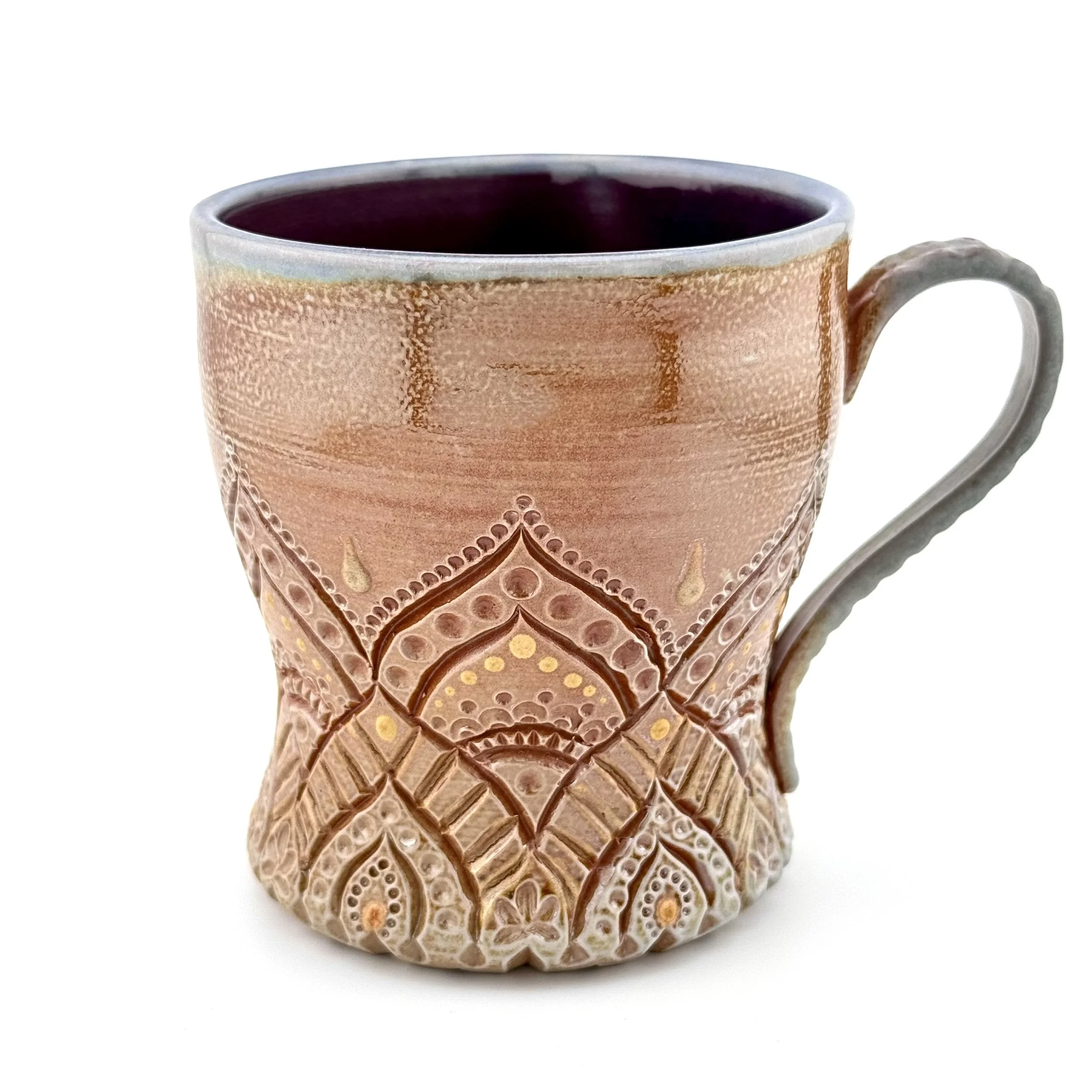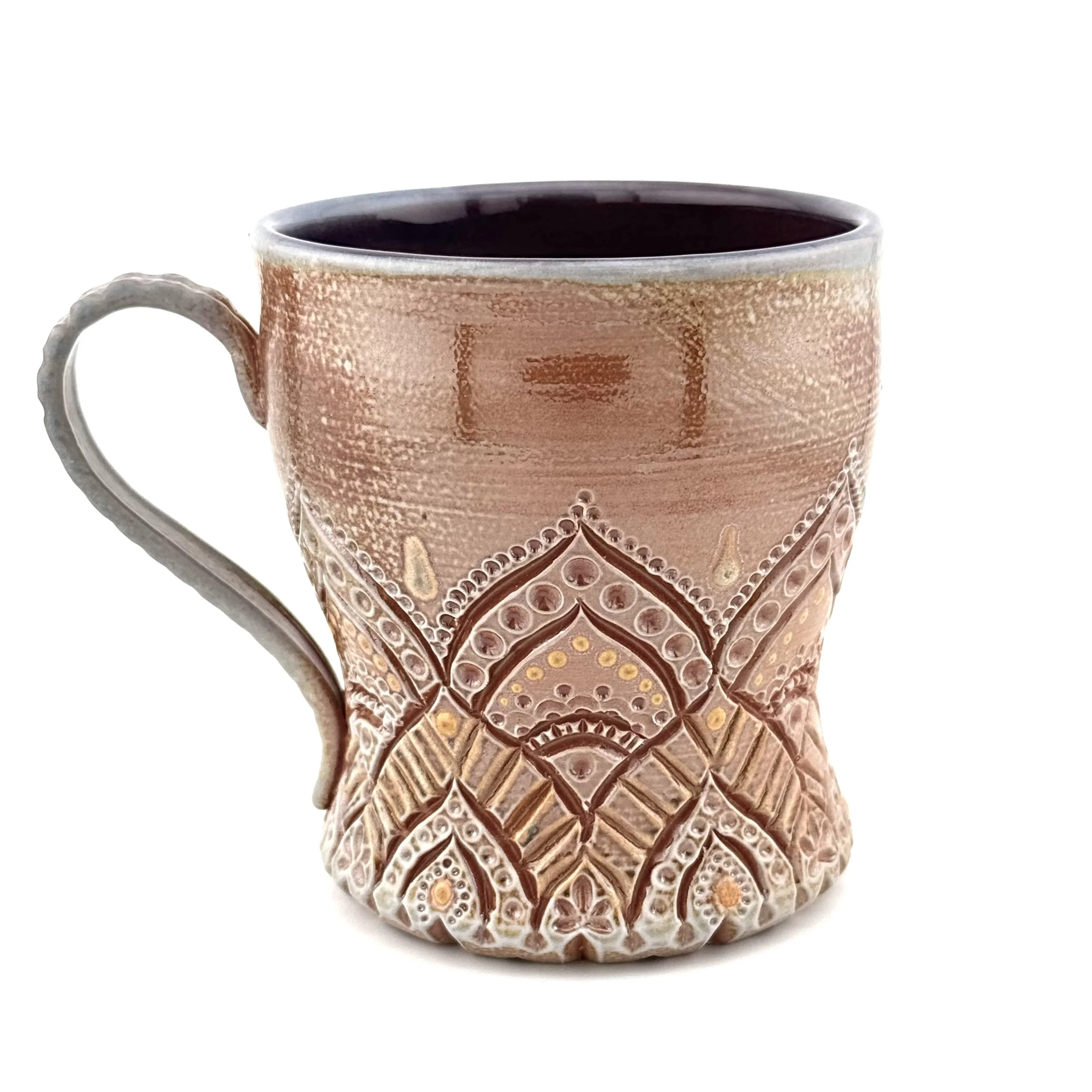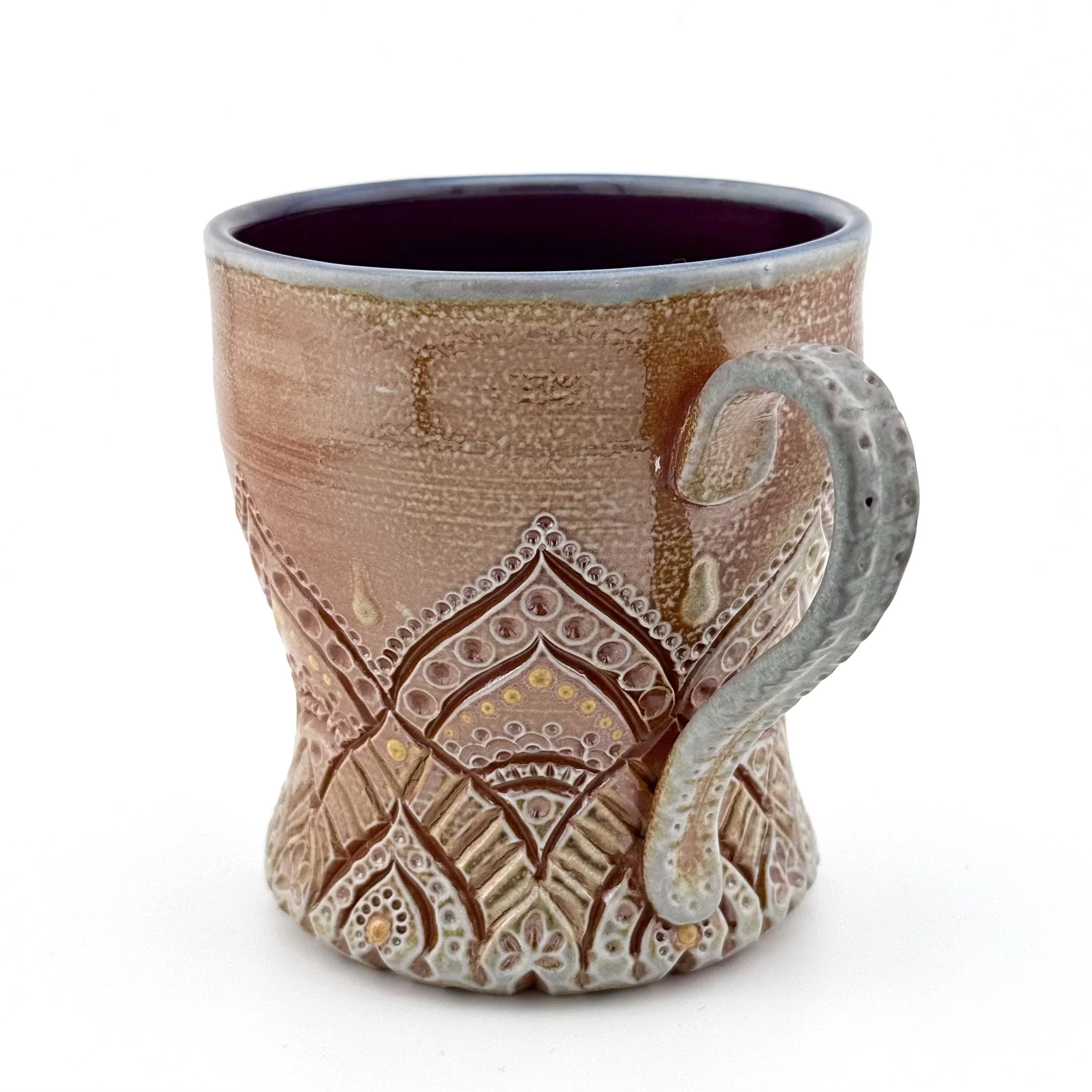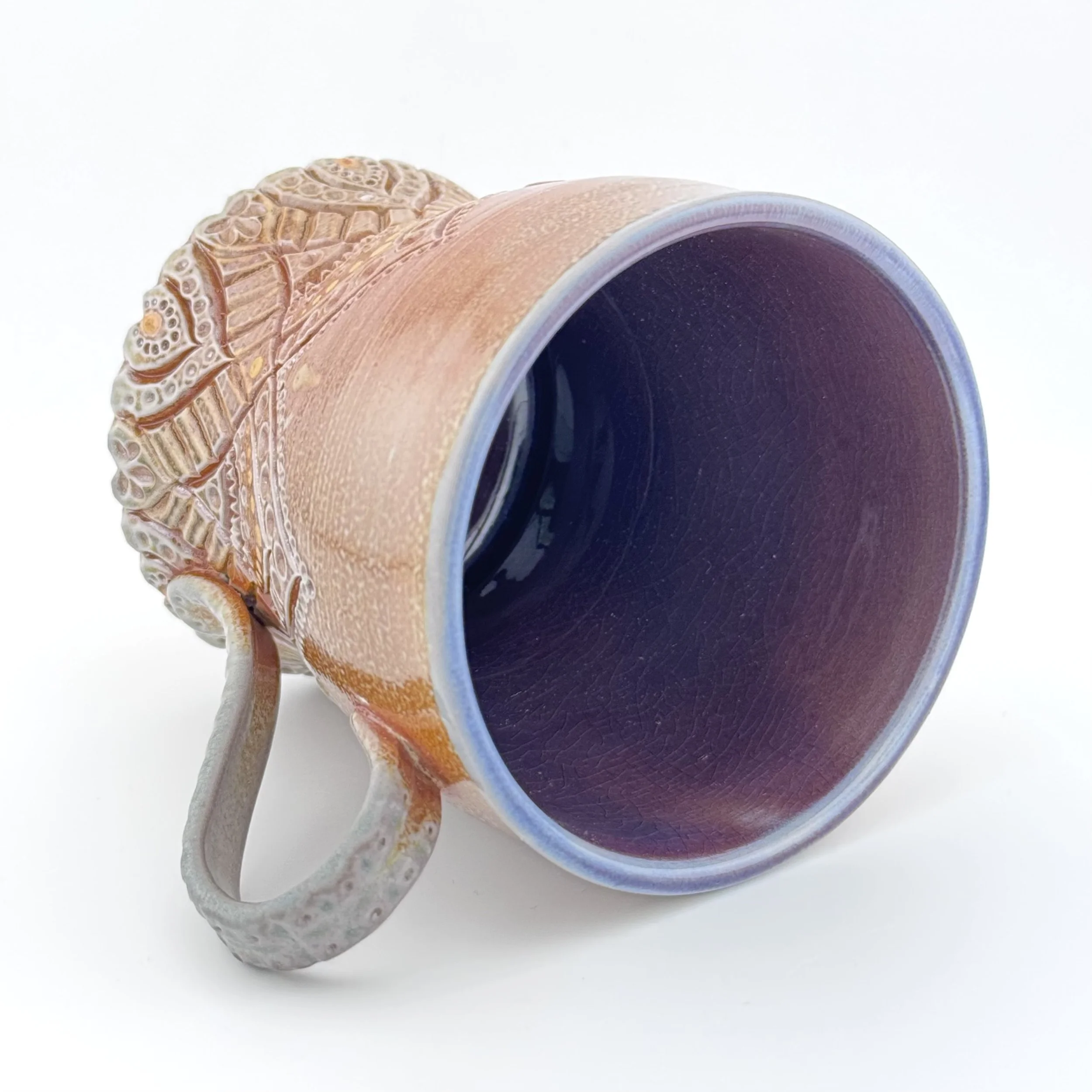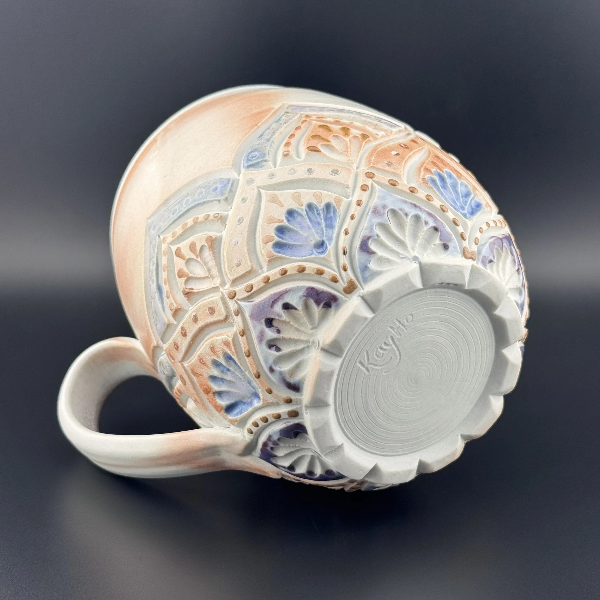 Hand carved and decorated with a sky blue porcelain slip, this mug has a great tactile quality. Where the glaze is thinnest, the clay shows through as a speckled tan, and where thicker its a deep denim blue. Enjoy with your coffee, or beverage of choice!