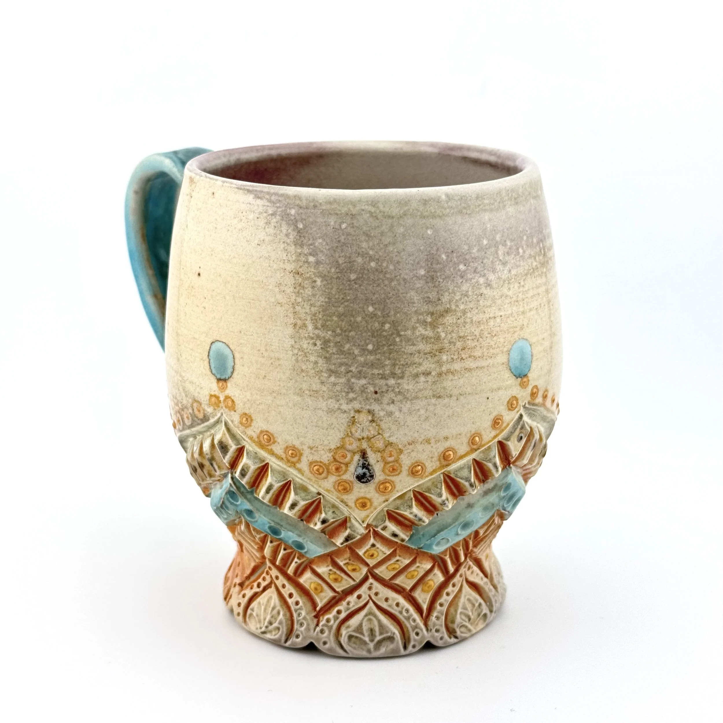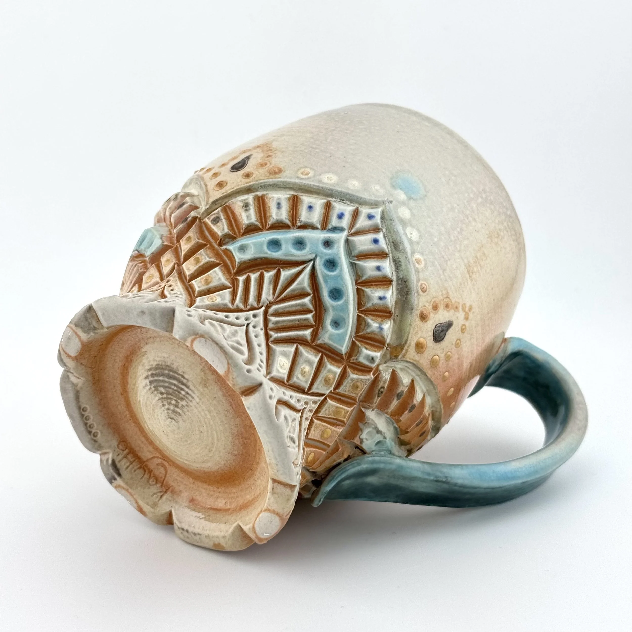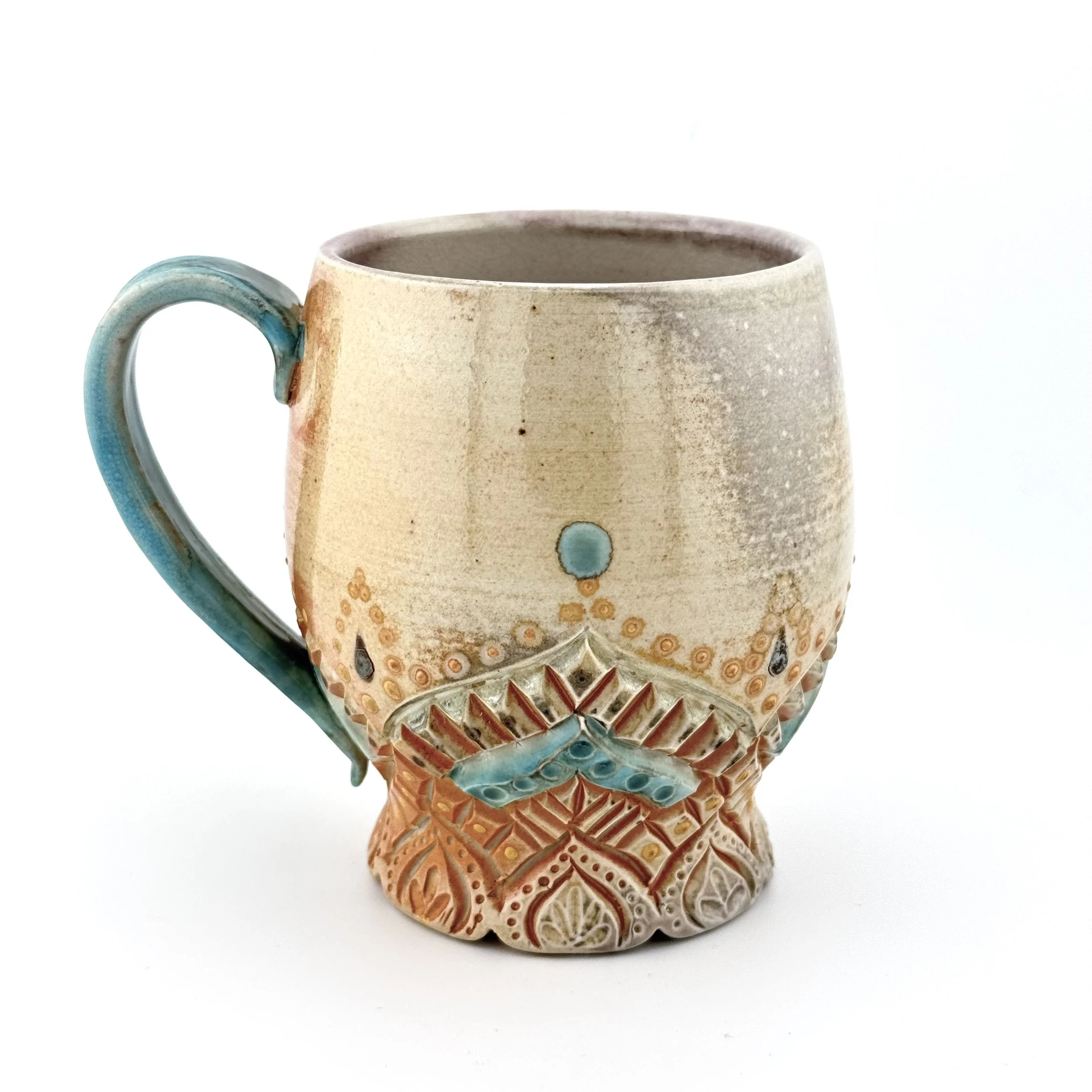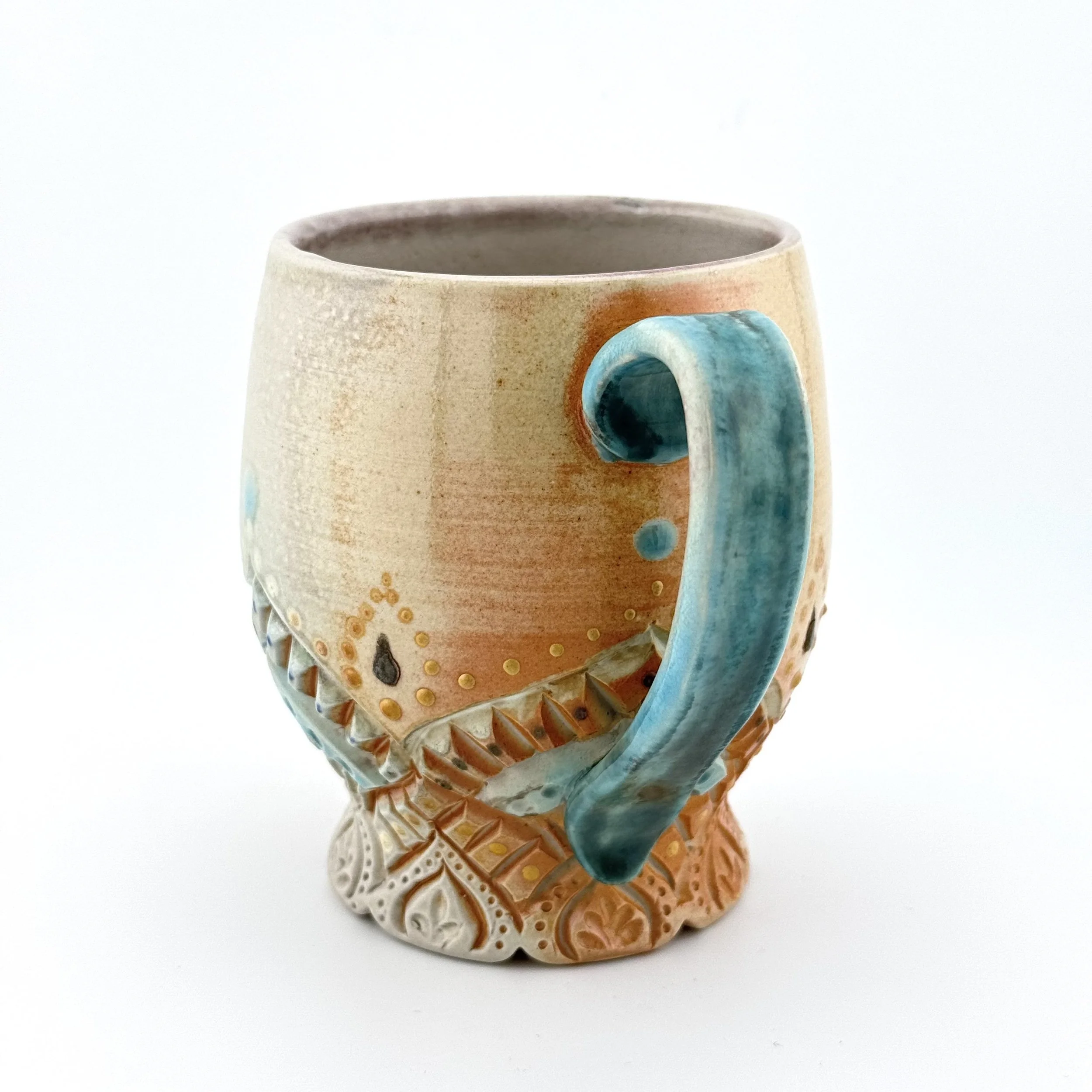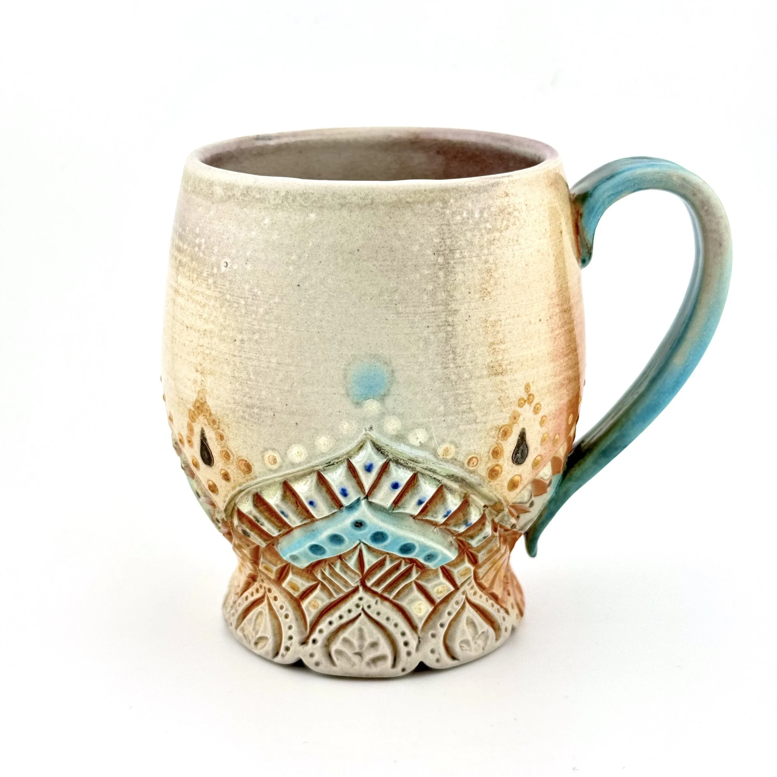 Hand carved and decorated with a porcelain slip, this mug has a beautiful, smooth sheen. Where the glaze is thinnest, the clay shows through a warm brown, and where thicker, it pools and shows movement in lighter blues. Your morning coffee will taste better from this mug. :)