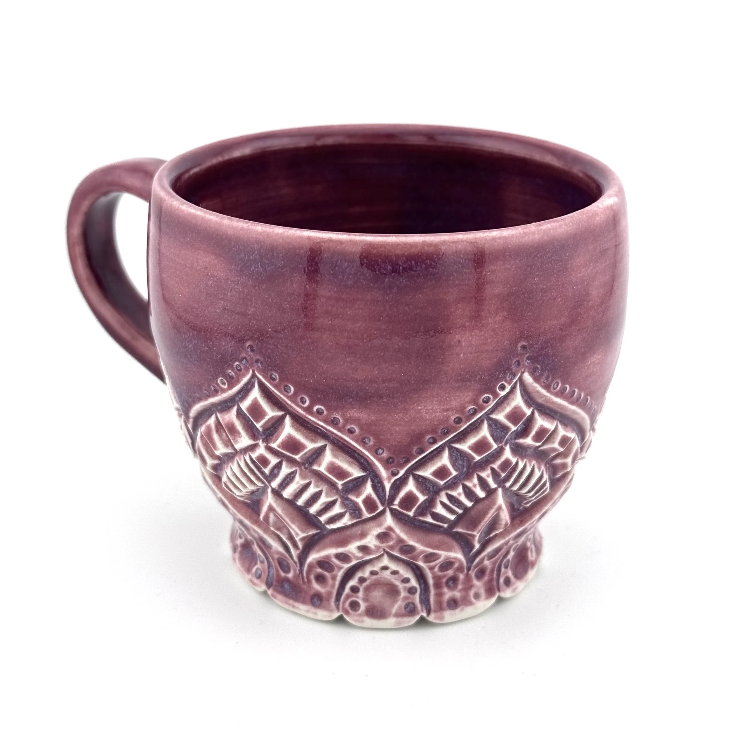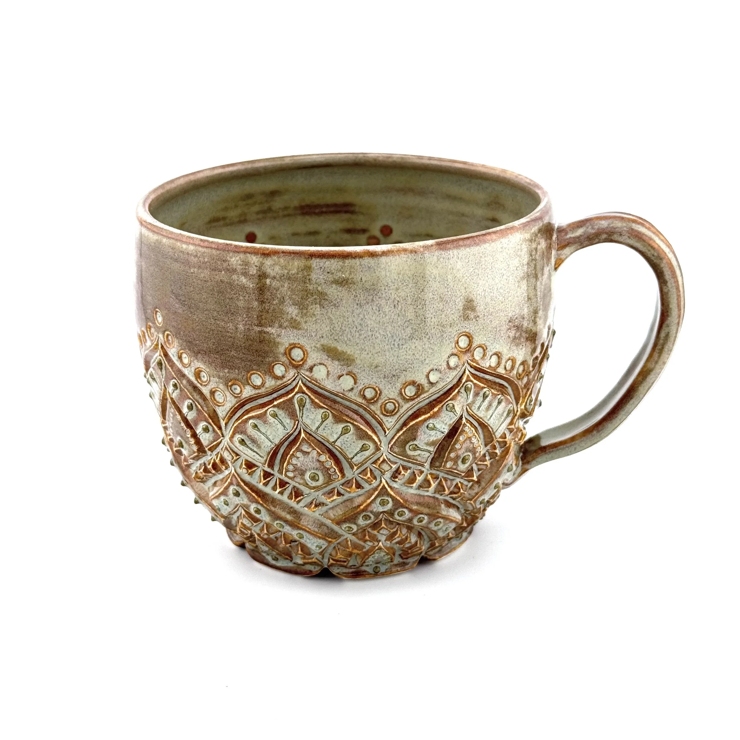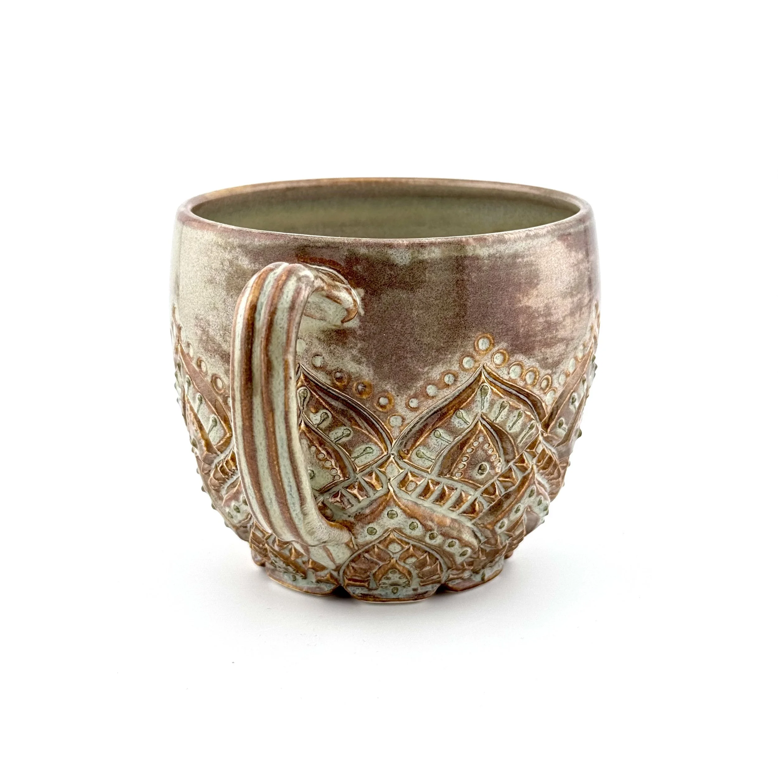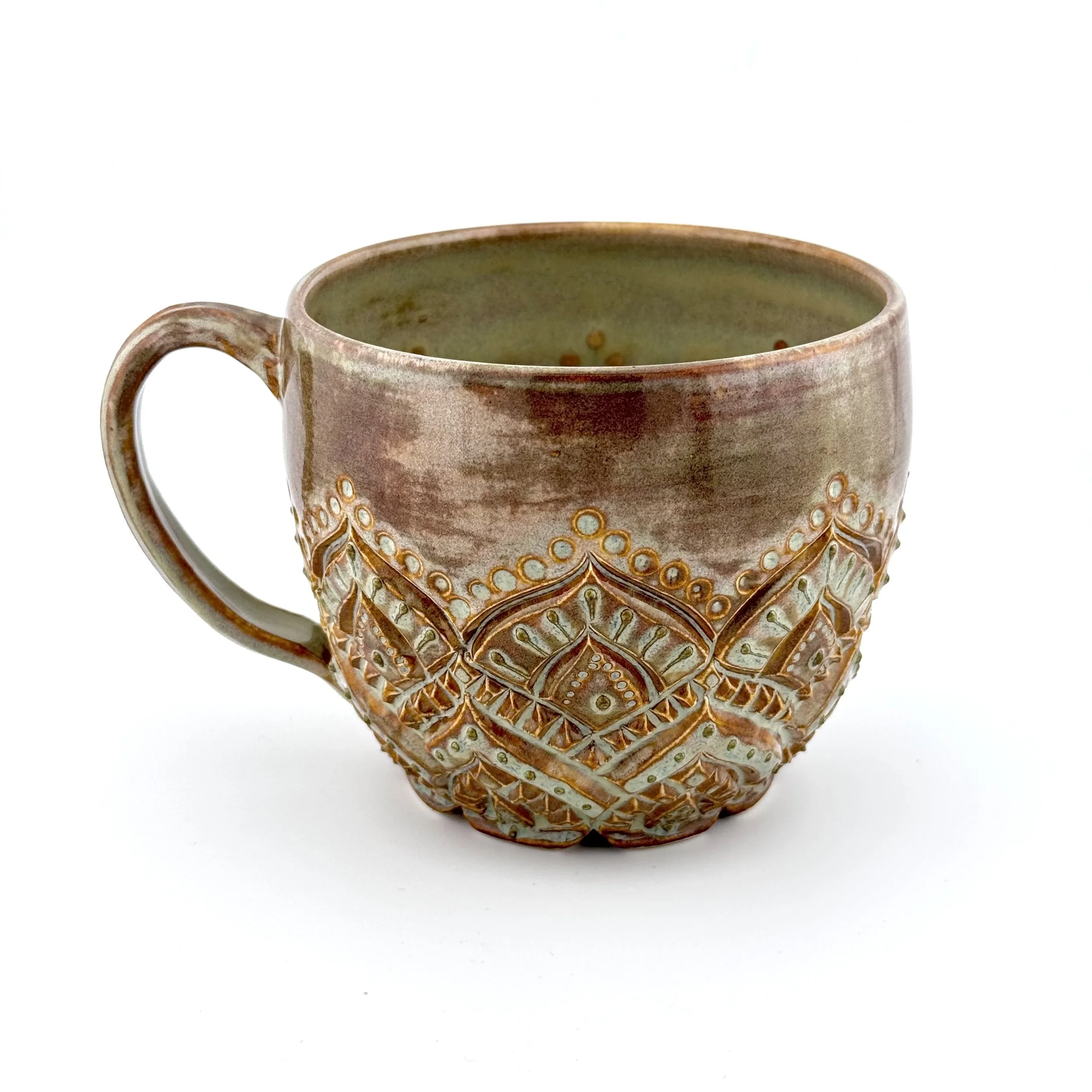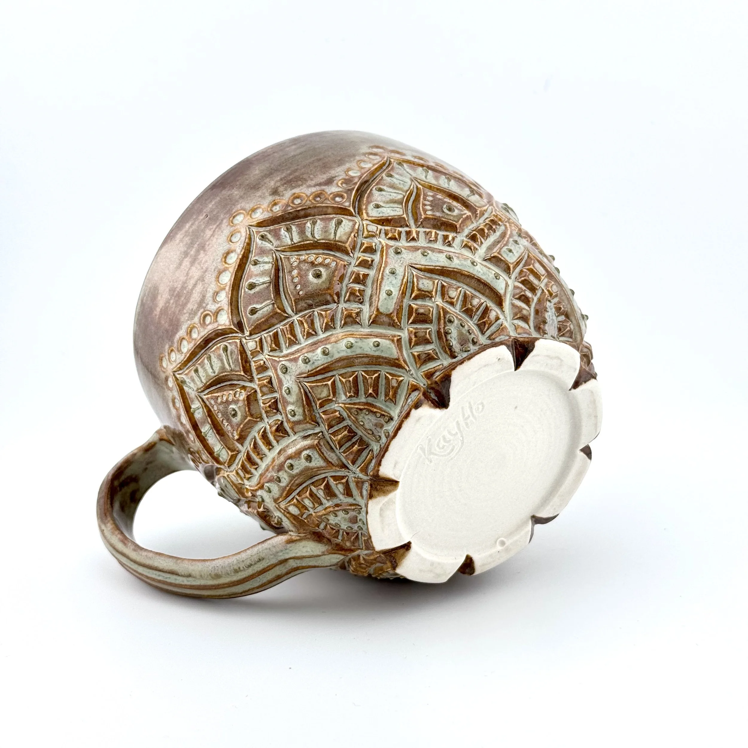 Hand carved and decorated with a porcelain slip, this mug has a beautiful, smooth sheen. Where the glaze is thinnest, the clay shows through a warm brown, and where thicker, it pools and shows movement in lighter blues. Your morning coffee will taste better from this mug. :)