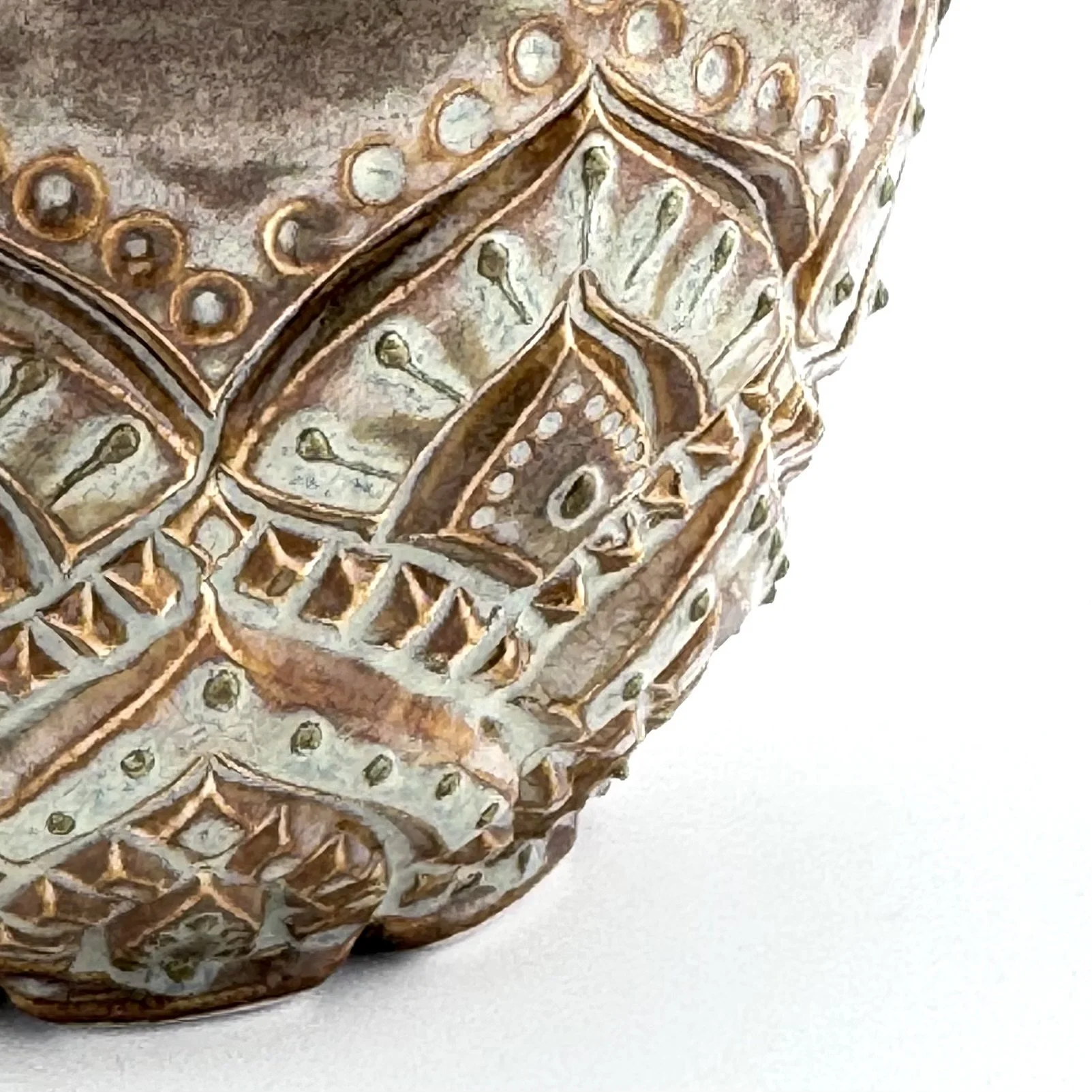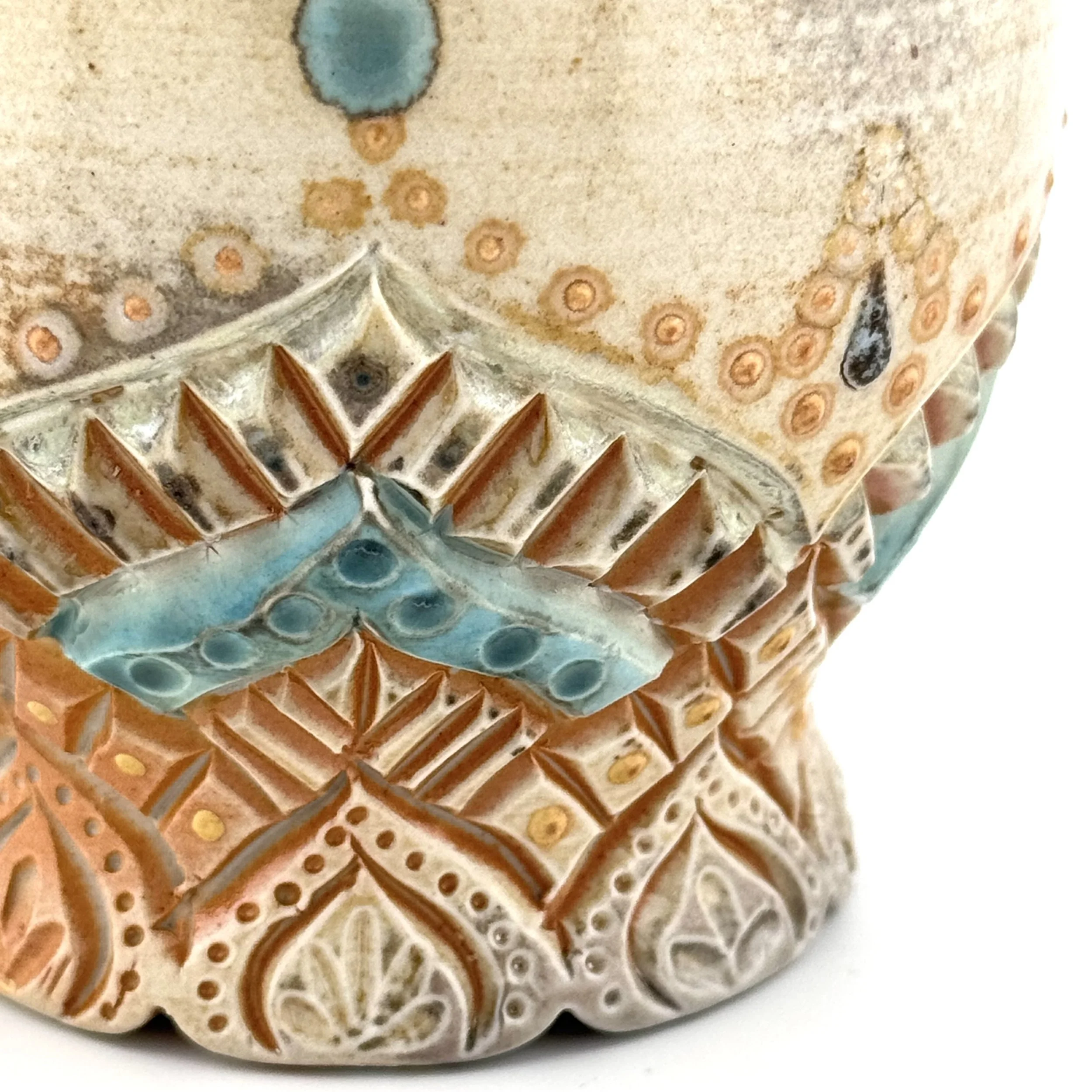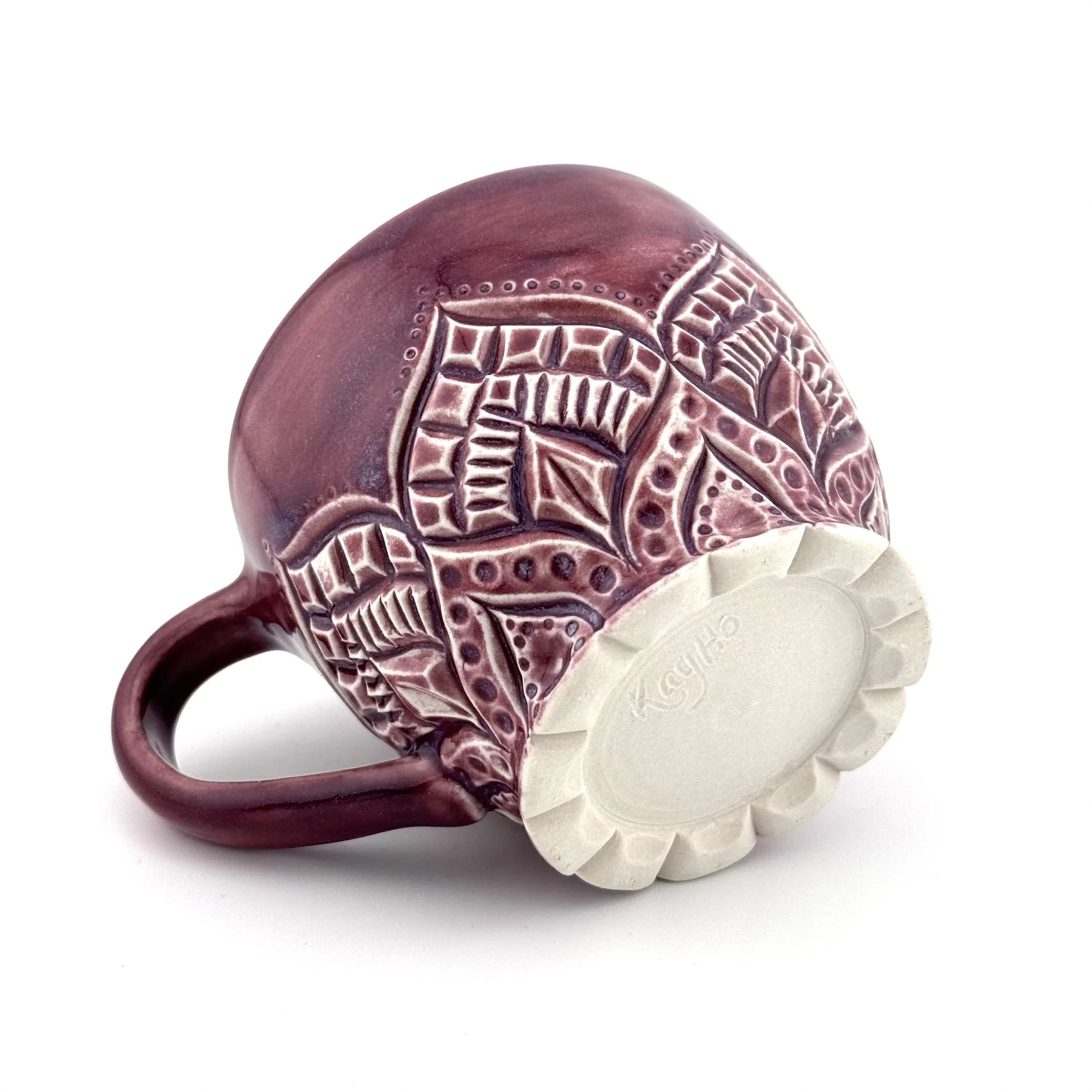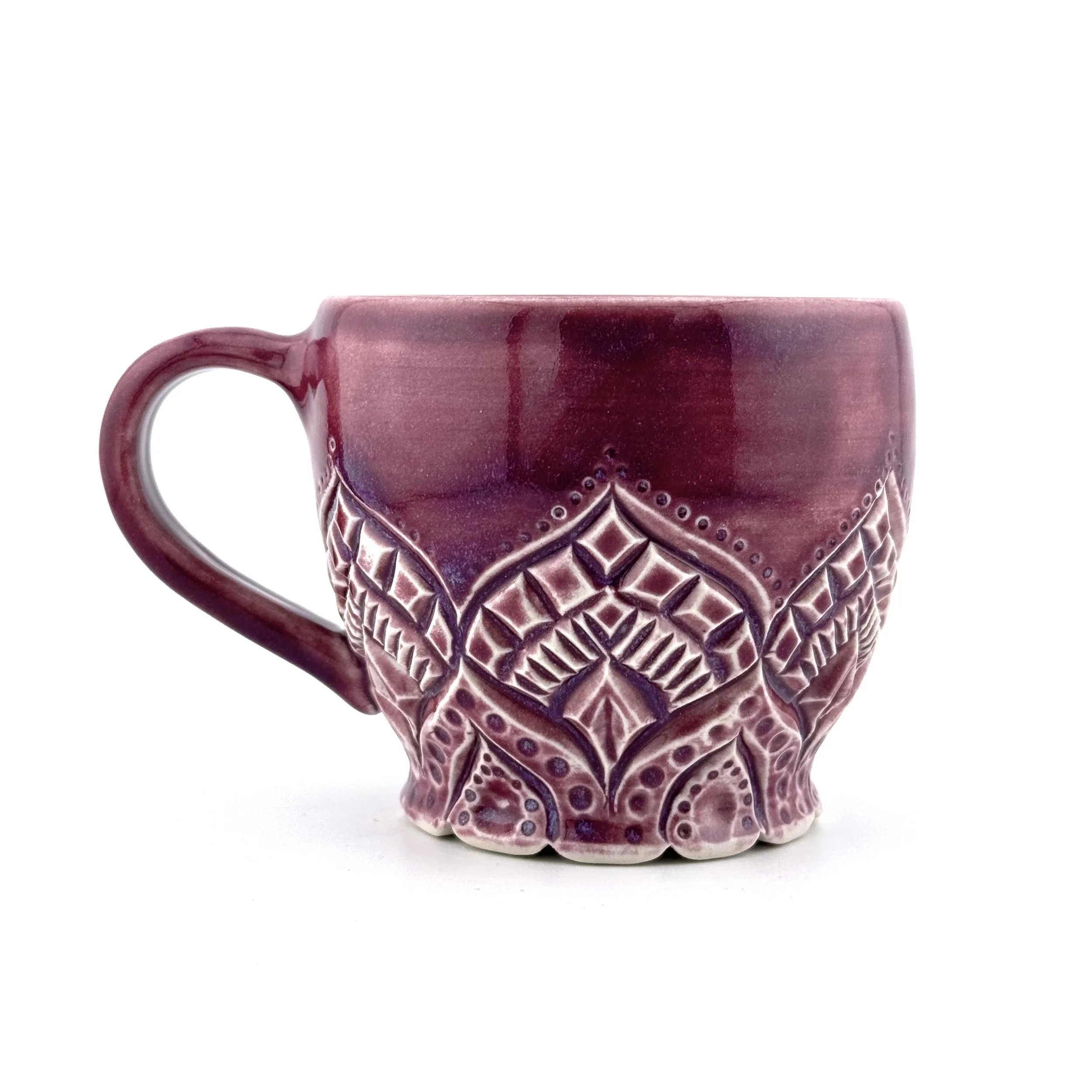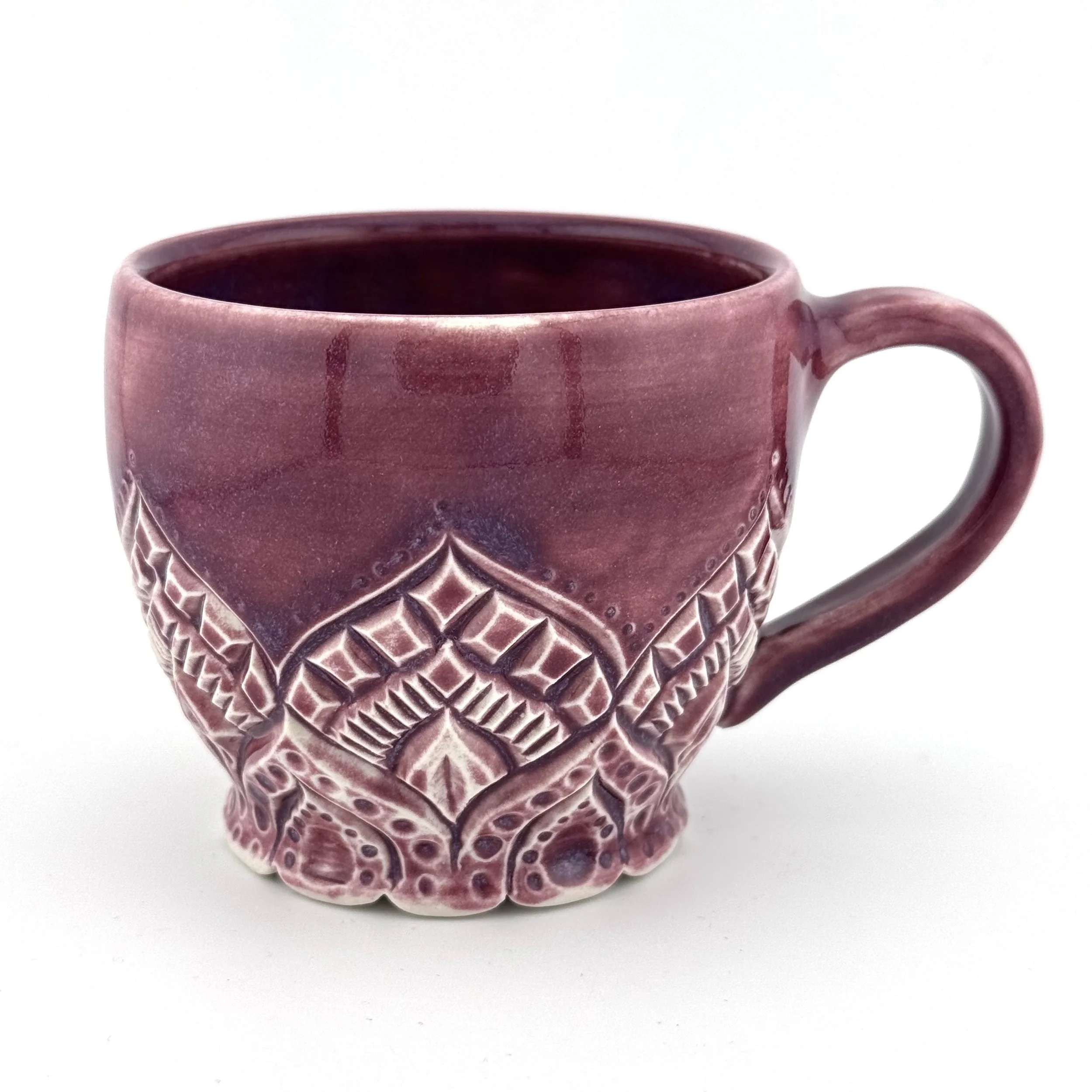 Hand carved and decorated with a porcelain slip, this mug has a beautiful, smooth sheen. Where the glaze is thinnest, the clay shows through a warm brown, and where thicker, it pools and shows movement in lighter blues. Your morning coffee will taste better from this mug. :)