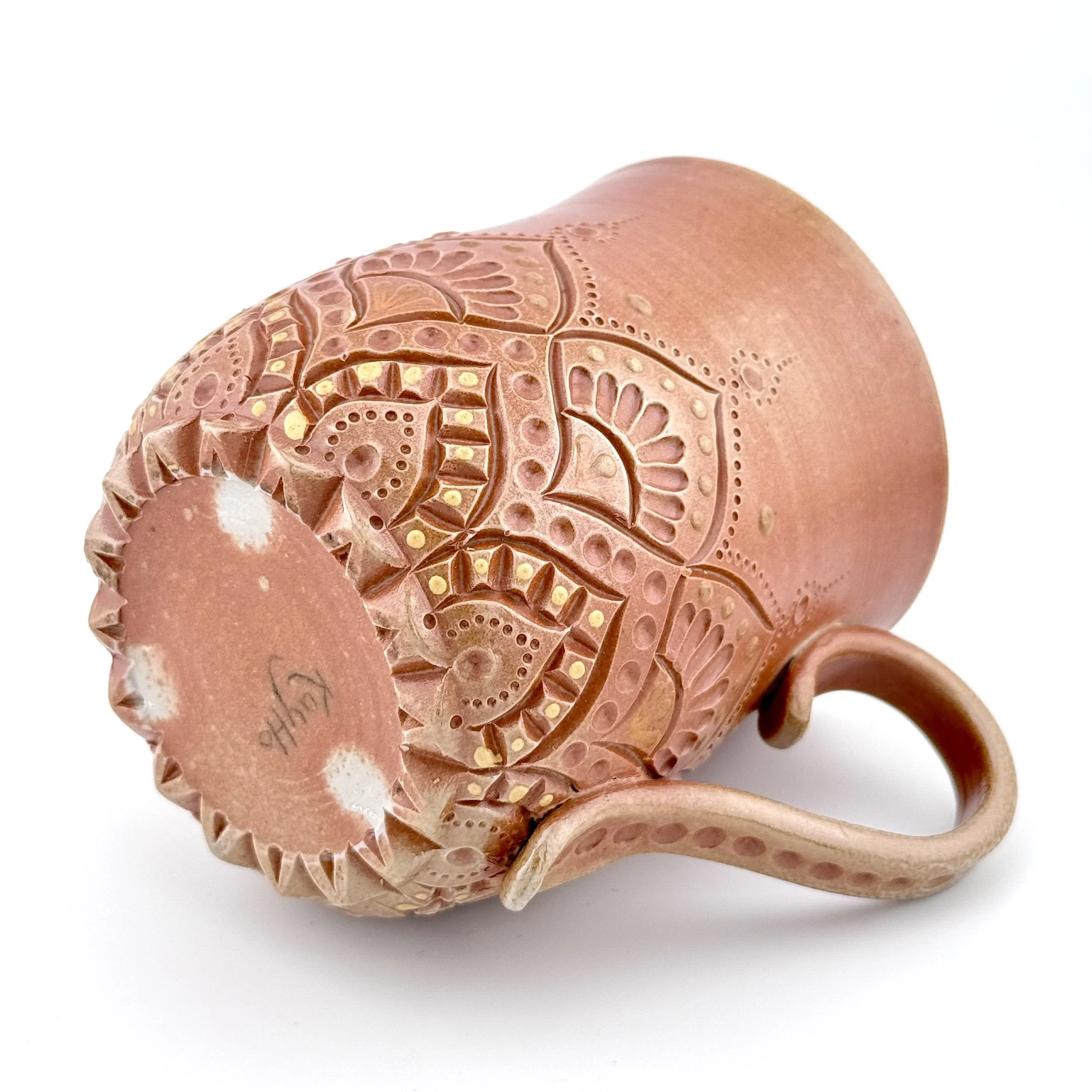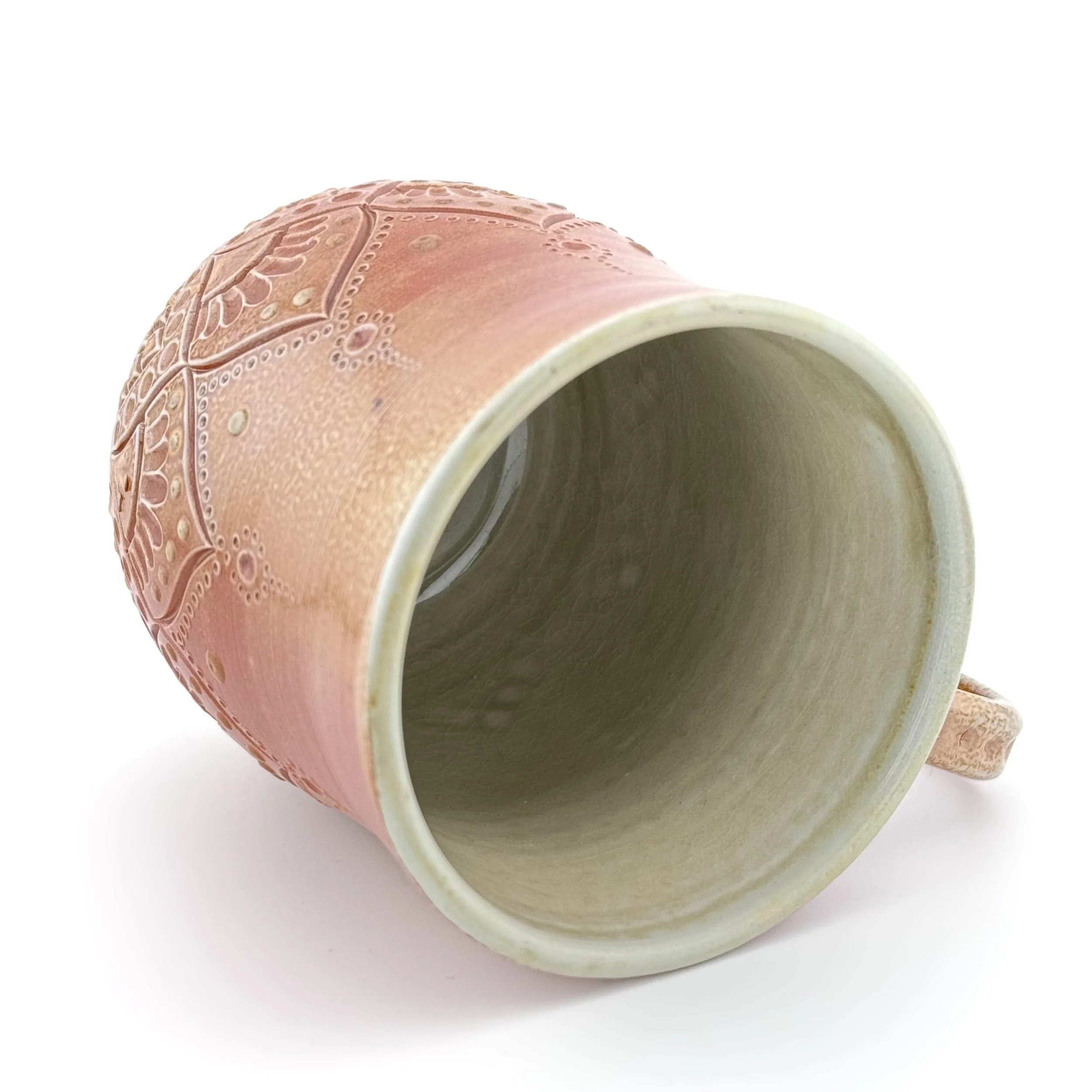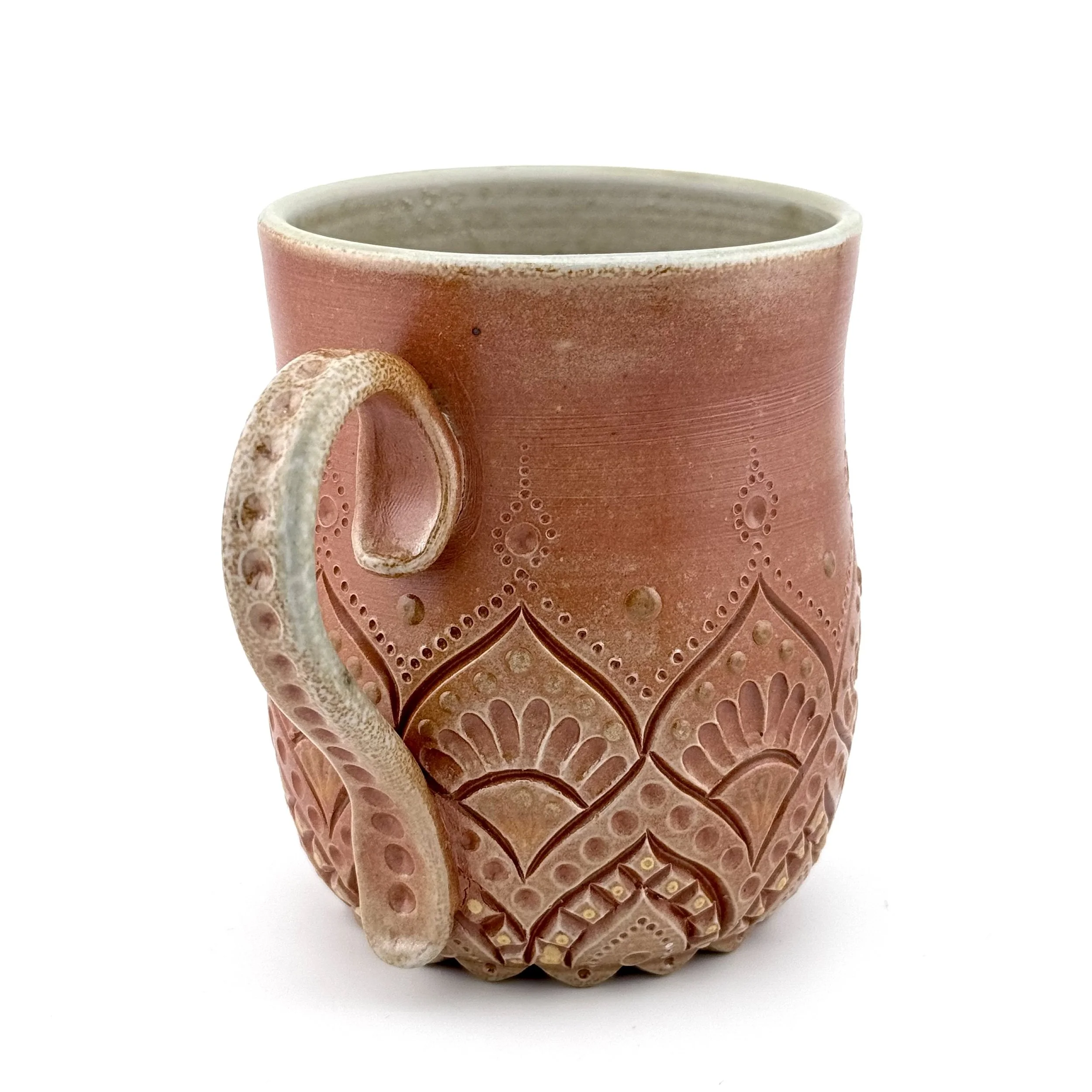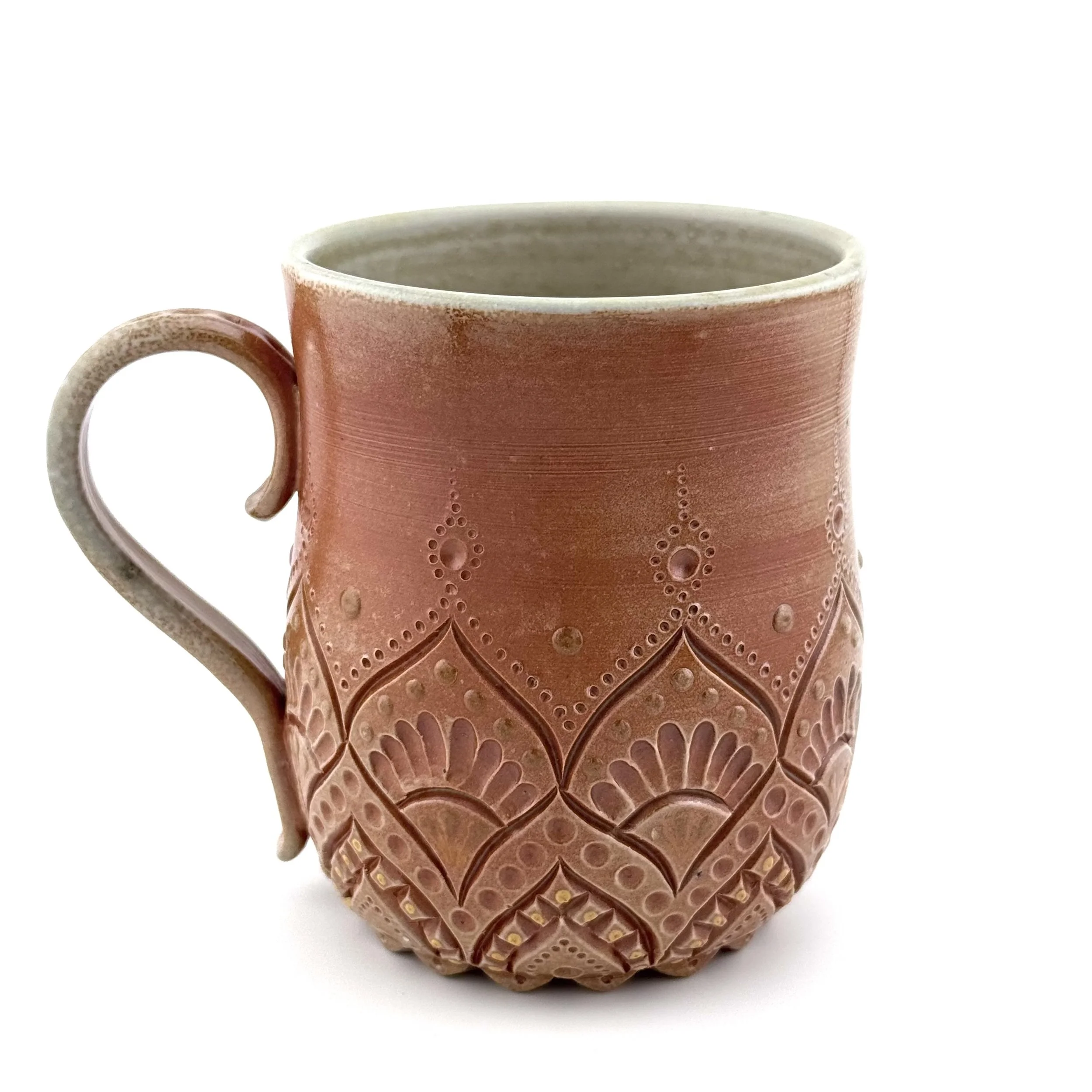Hand carved, decorated with porcelain slip, and fired in a special soda kiln, this stoneware mug has toasty colors on the outside and is purplish inside. Enjoy your coffee or beverage of choice even more when you use this special mug!