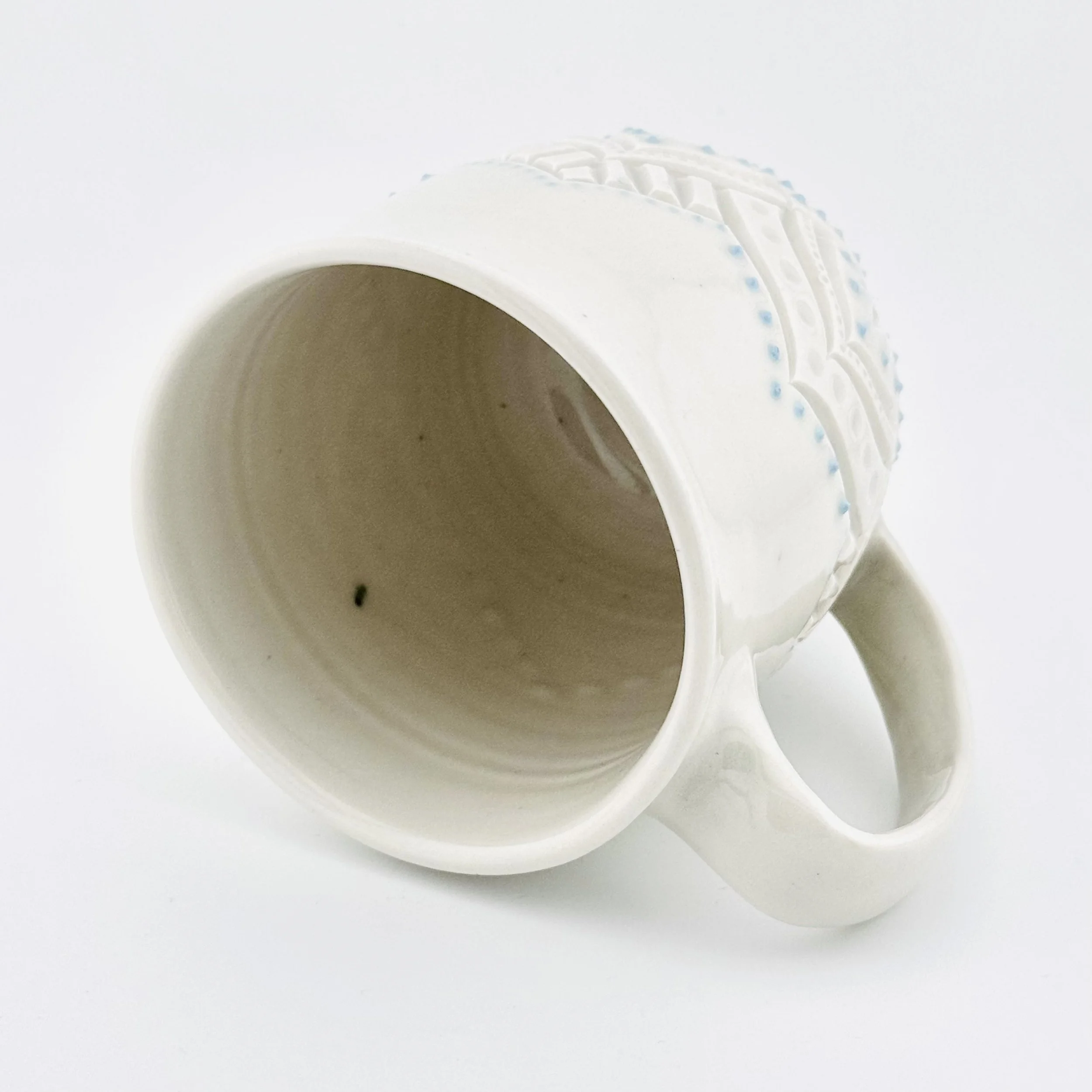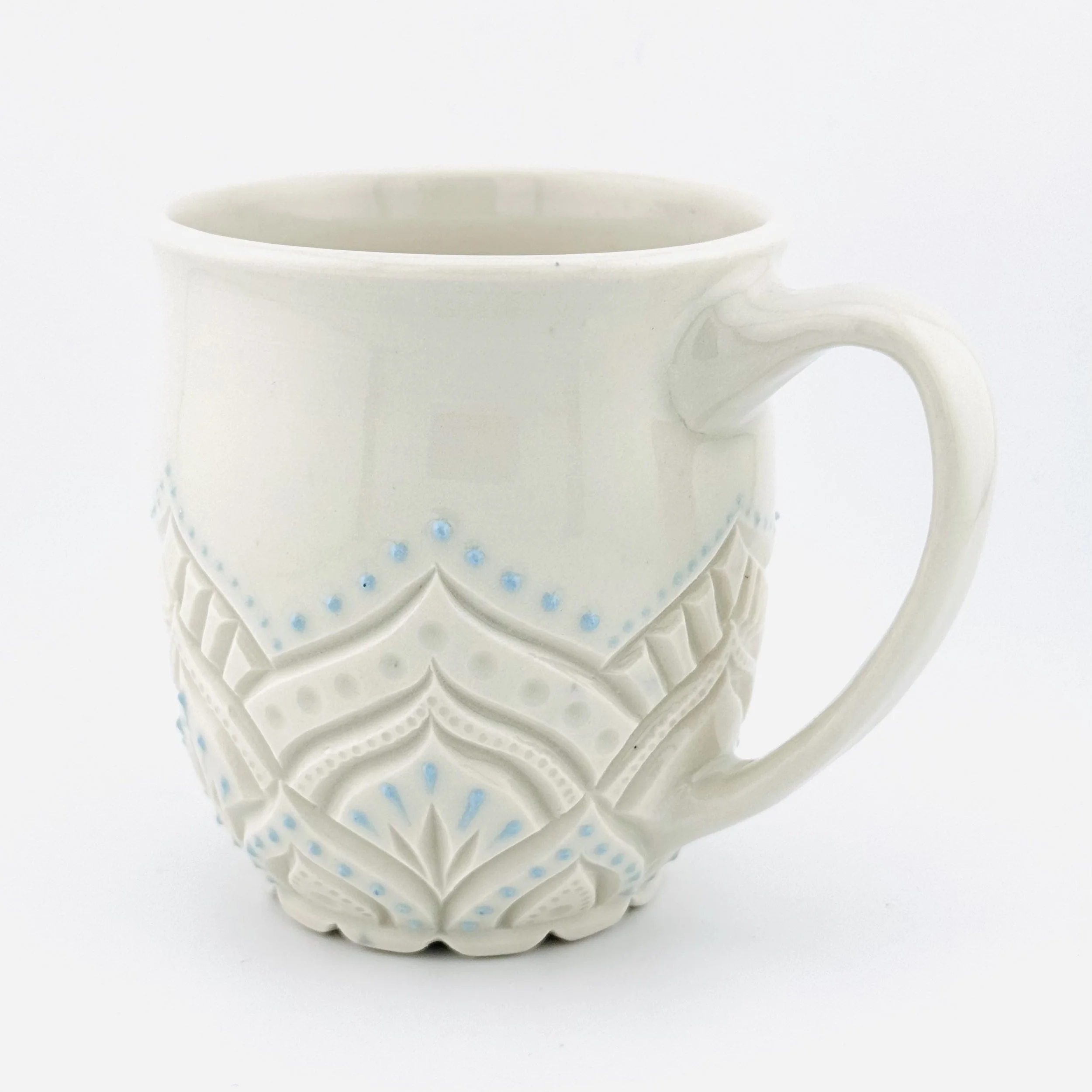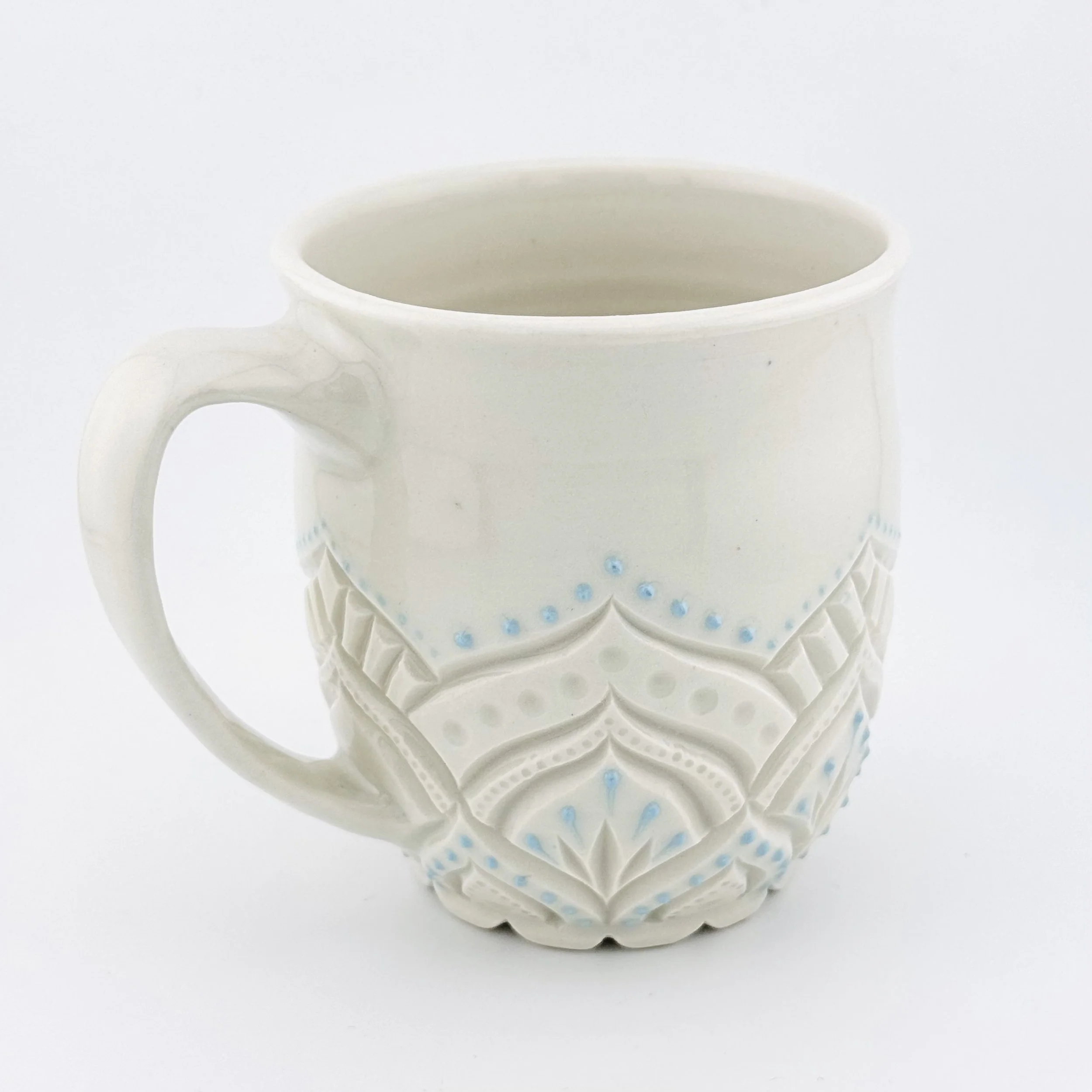 Hand carved, selectively glazed, and decorated with porcelain slip, this one of a kind mug was soda fired in a special kiln. It gets the beautifully varied colors on its surface from this atmospheric and unpredictable firing process, and the interior is a contrasting dark, shiny purple. Enjoy your coffee or beverage of choice even more when you use this special, large mug!