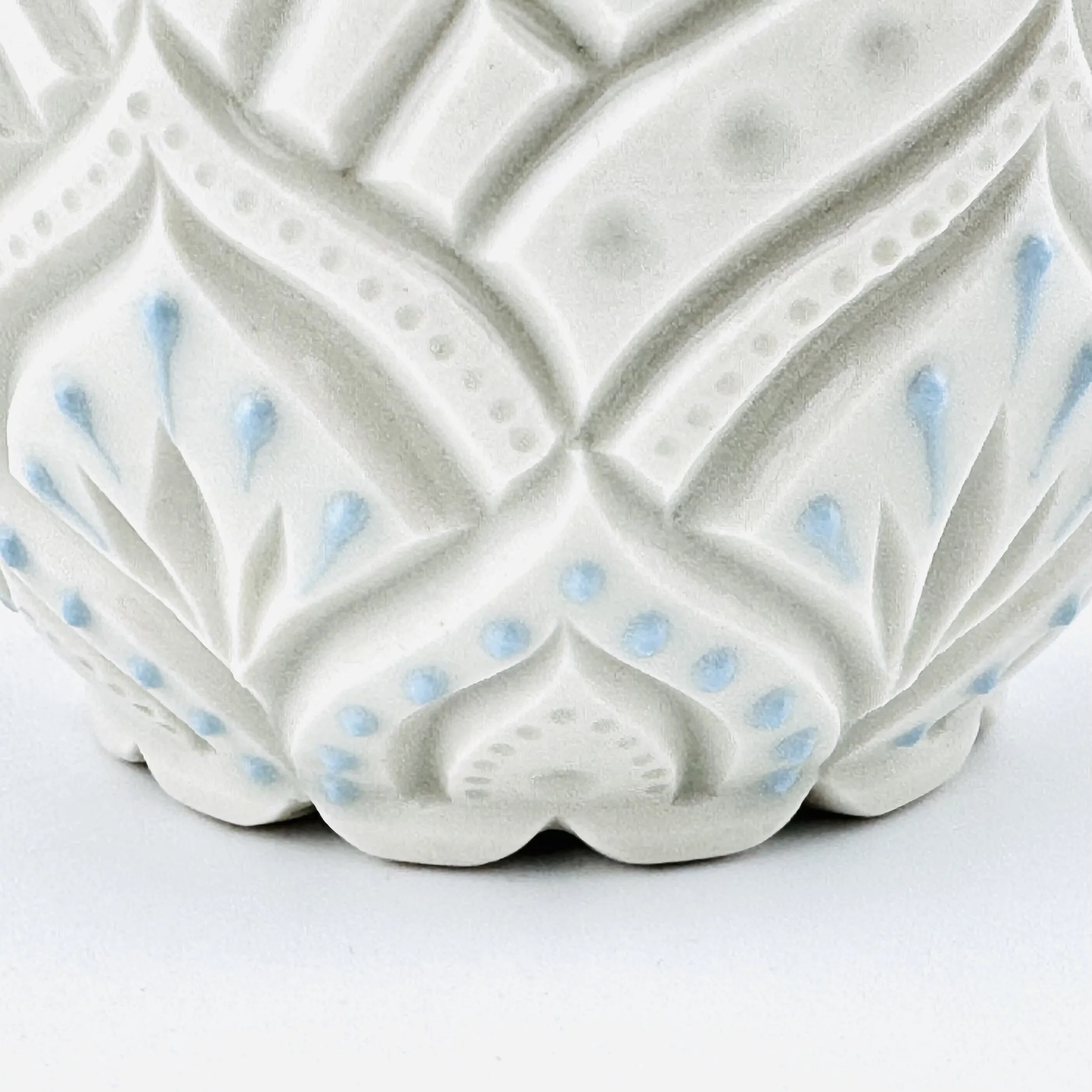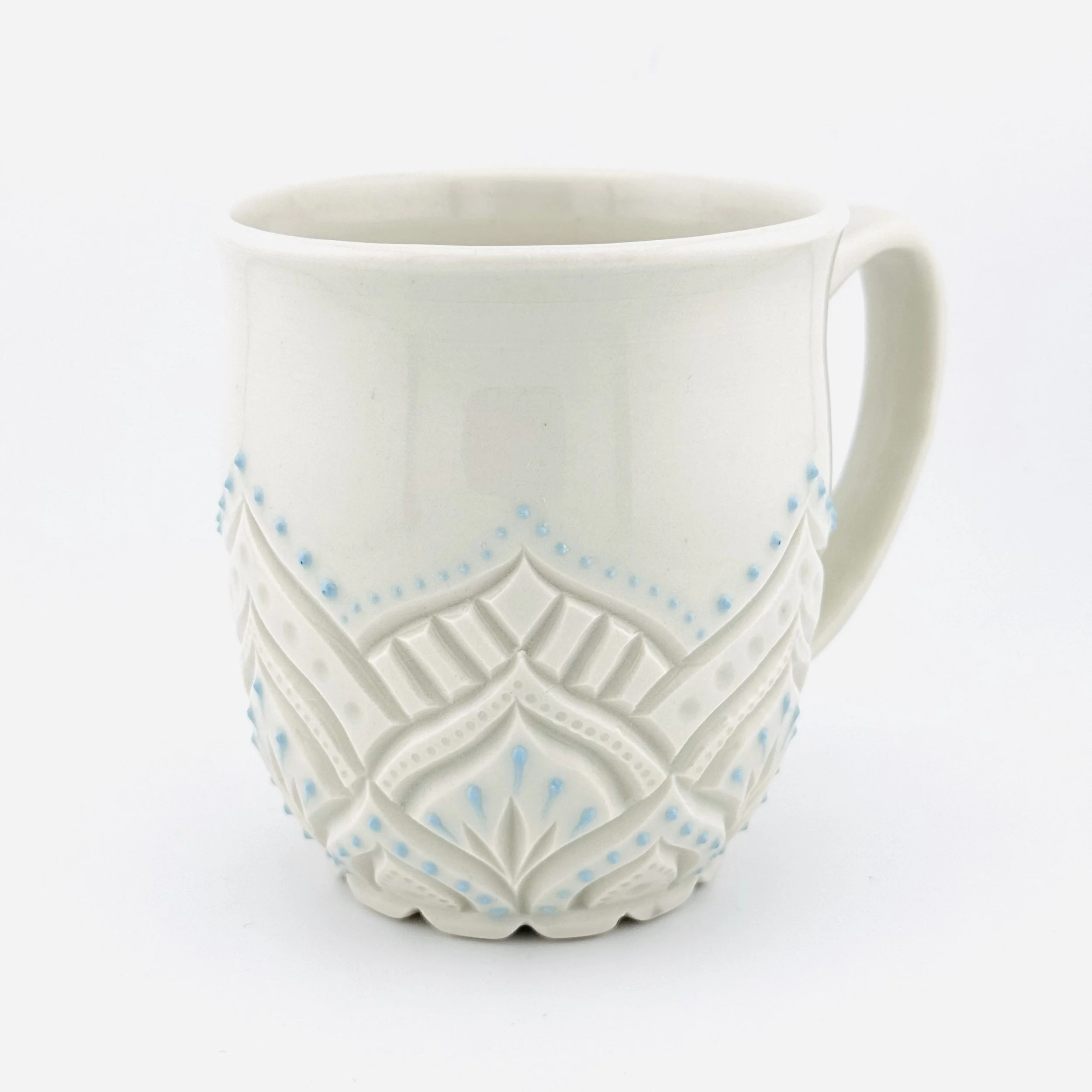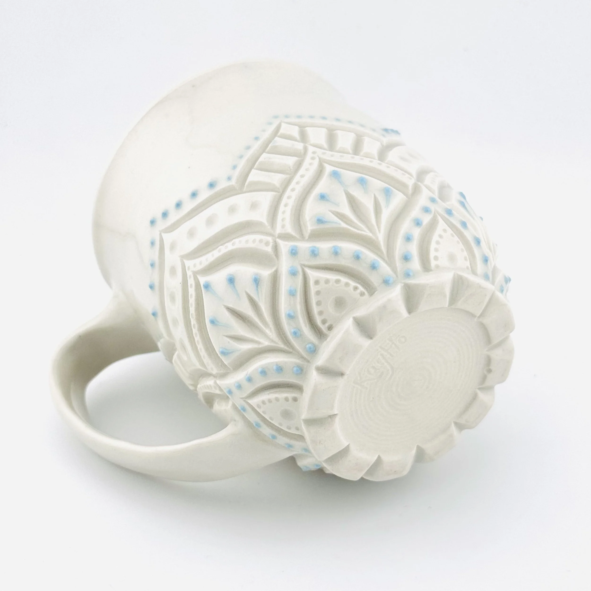 Hand carved, selectively glazed, and decorated with porcelain slip, this one of a kind mug was soda fired in a special kiln. It gets the beautifully varied colors on its surface from this atmospheric and unpredictable firing process, and the interior is a contrasting dark, shiny purple. Enjoy your coffee or beverage of choice even more when you use this special, large mug!